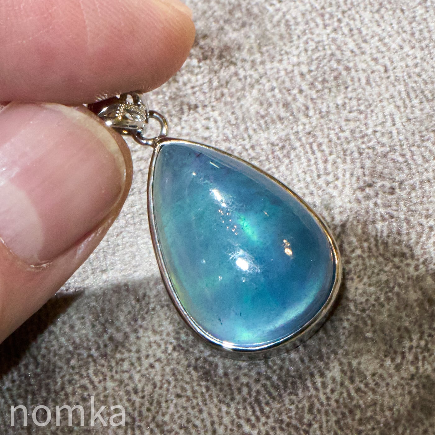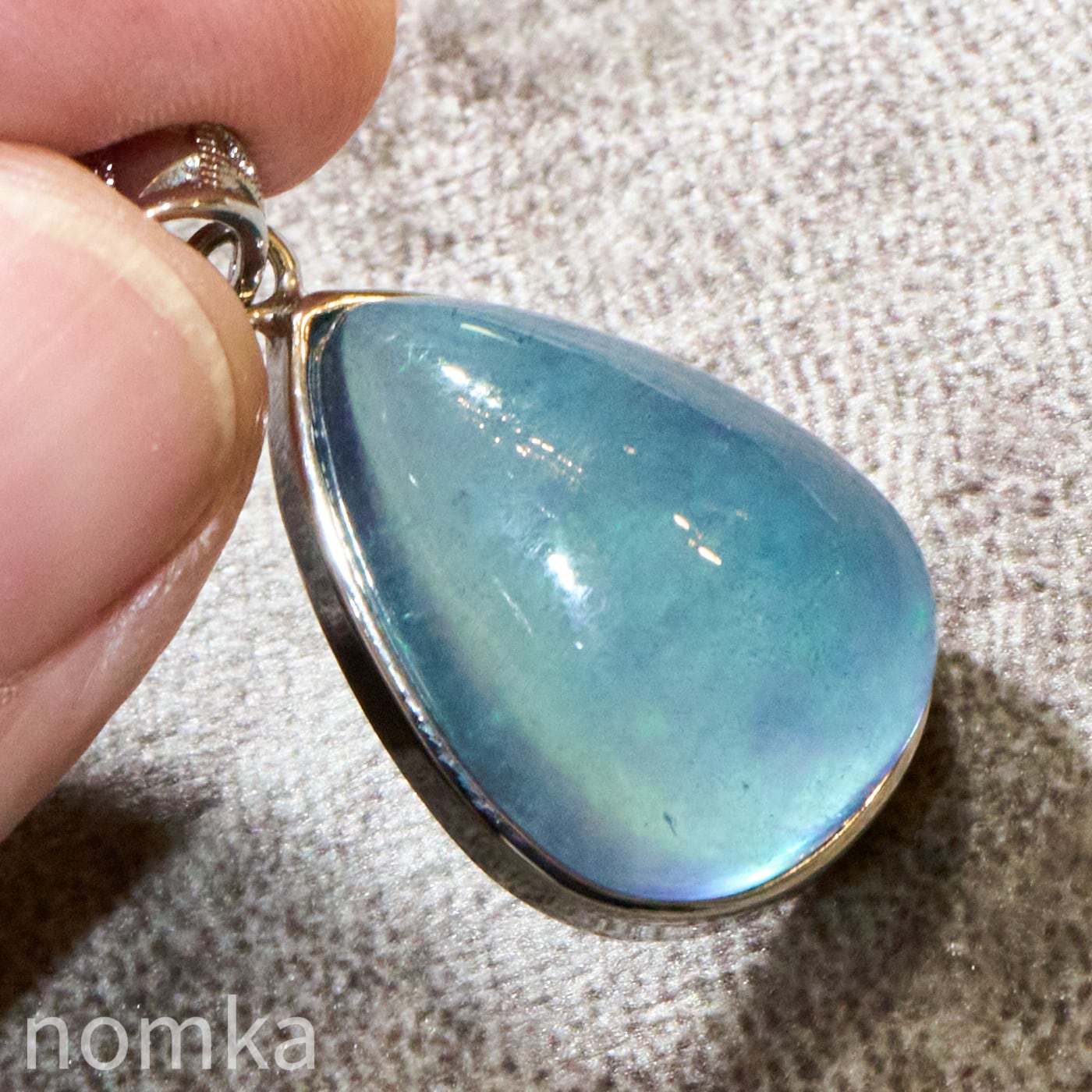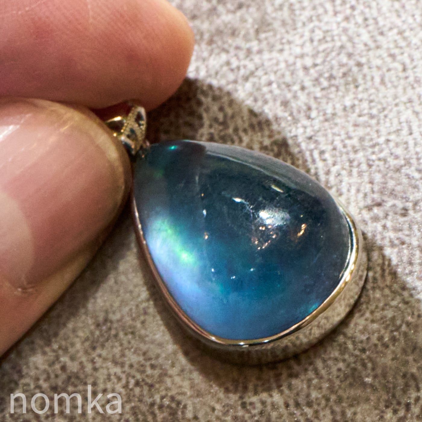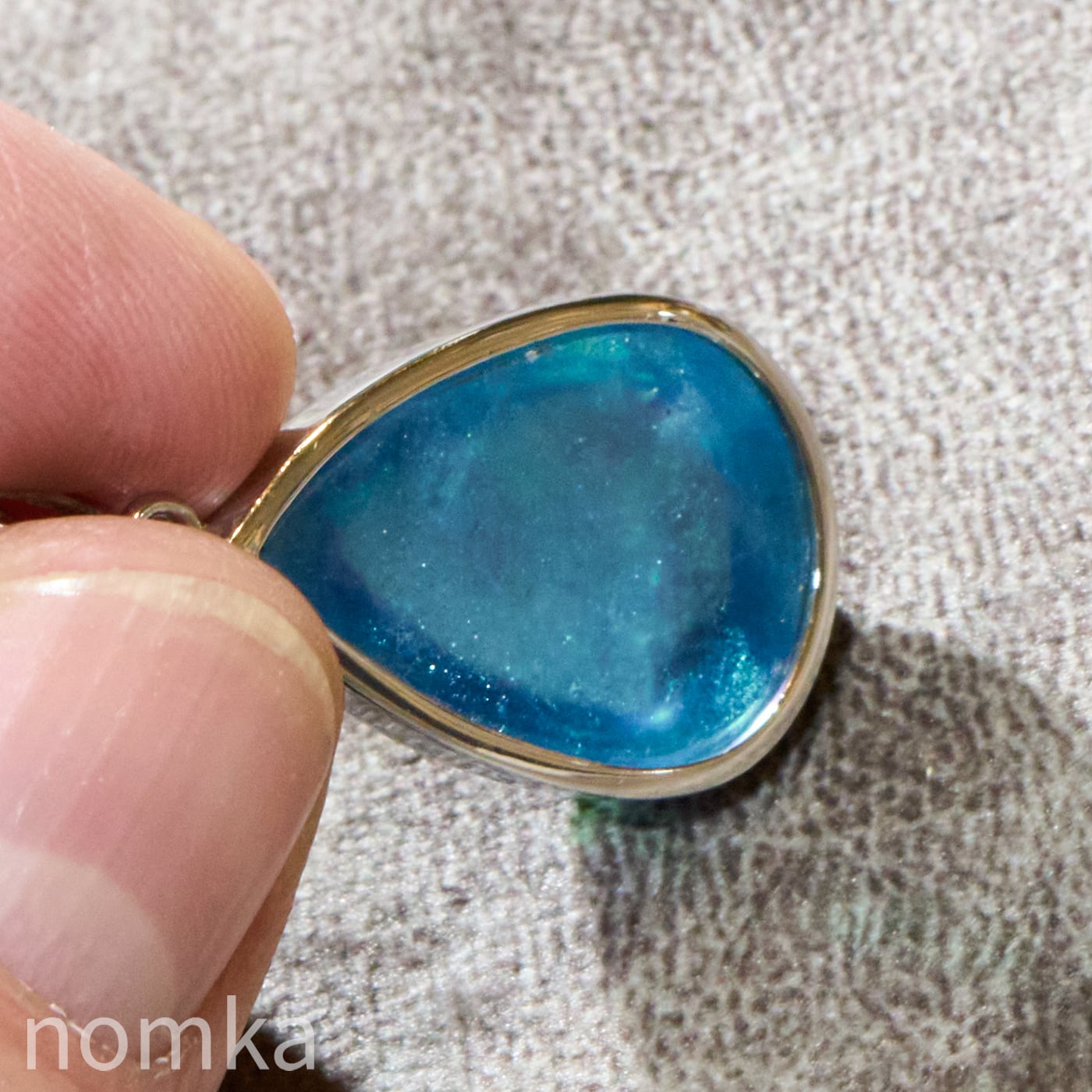 30mmを超える圧倒的な存在感を放つ大粒のペアシェイプ(しずく型)にカット。表面は滑らかなカボション仕上げとなっており、石の内部に広がる幻想的なインクルージョンや、水底を覗き込むような奥行きのある表情を存分に堪能できます。