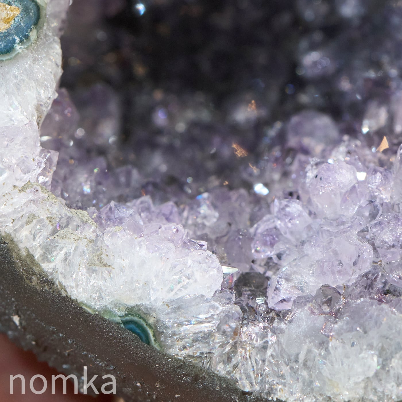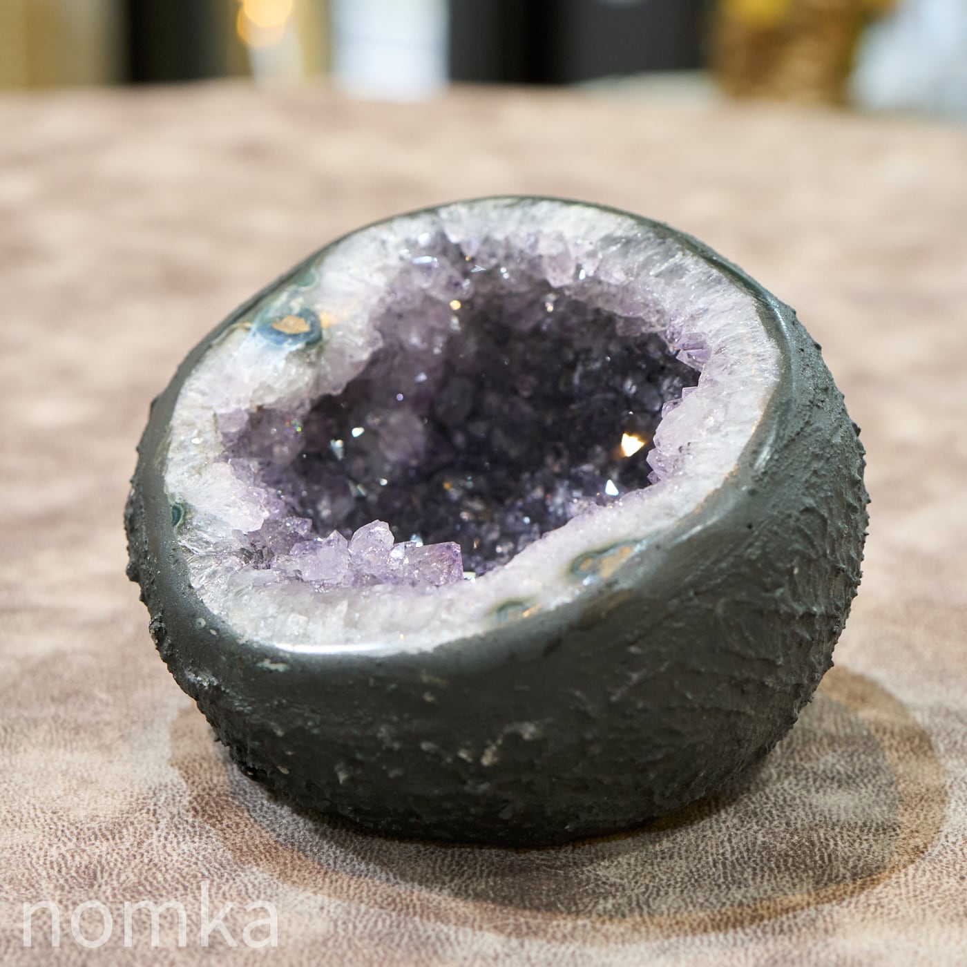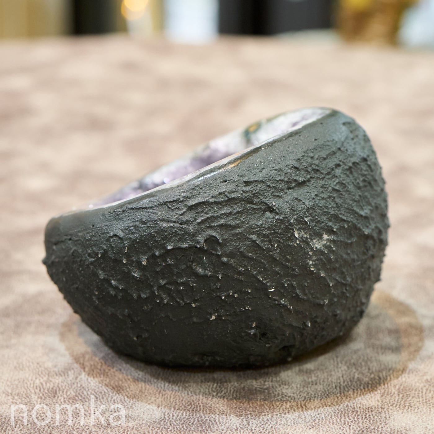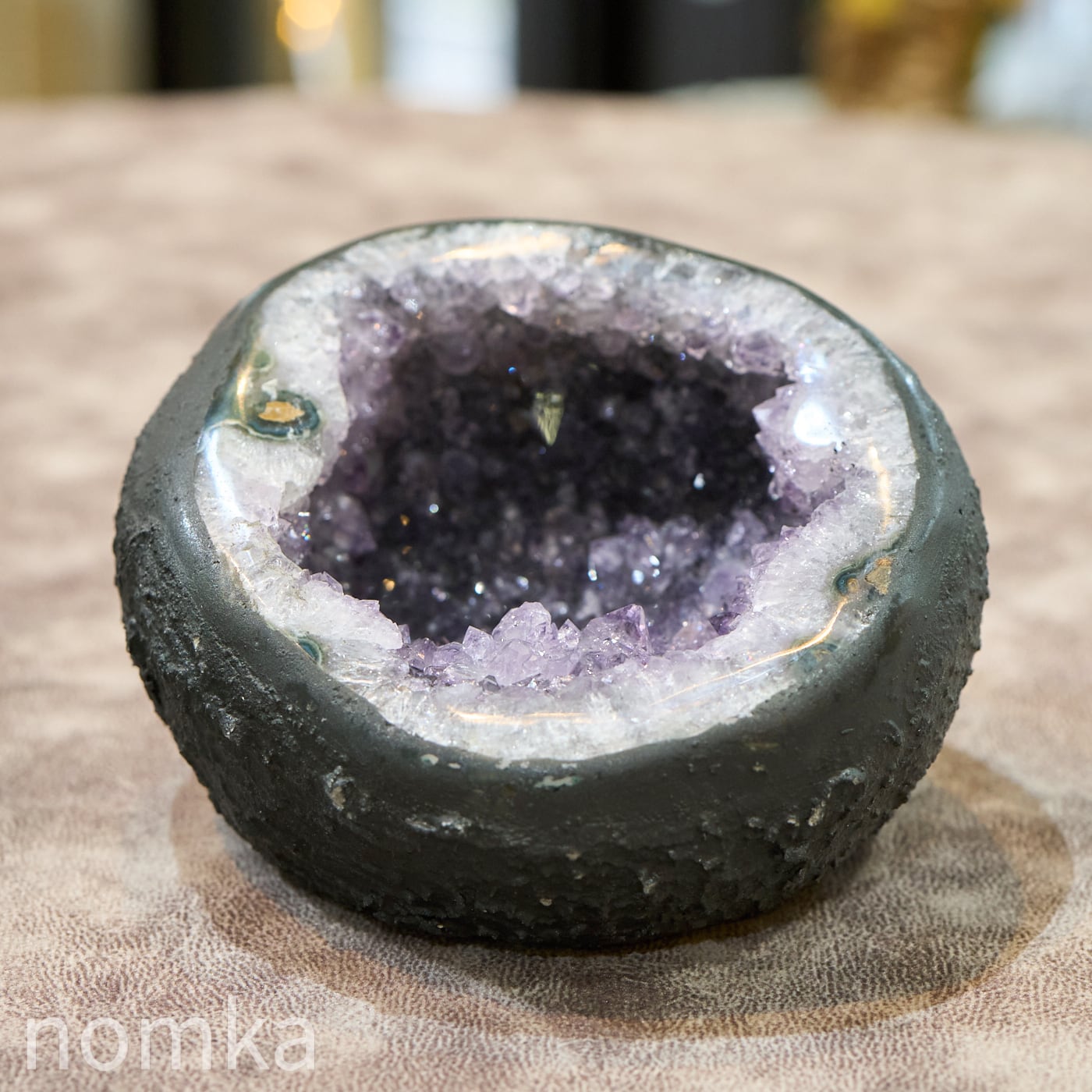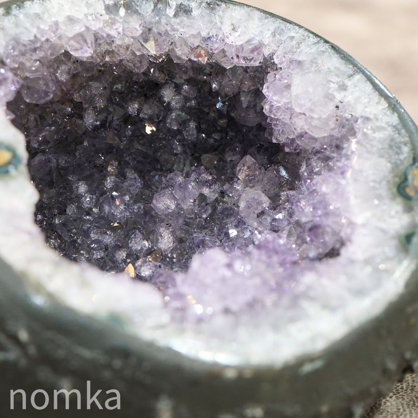 この個体の最大の魅力は、なんといってもその愛らしいフォルム。まるで幸運をそっと掬い上げる「お椀」のような形をしており、内部には濃淡豊かなアメジストの結晶がぎっしりと輝いています。