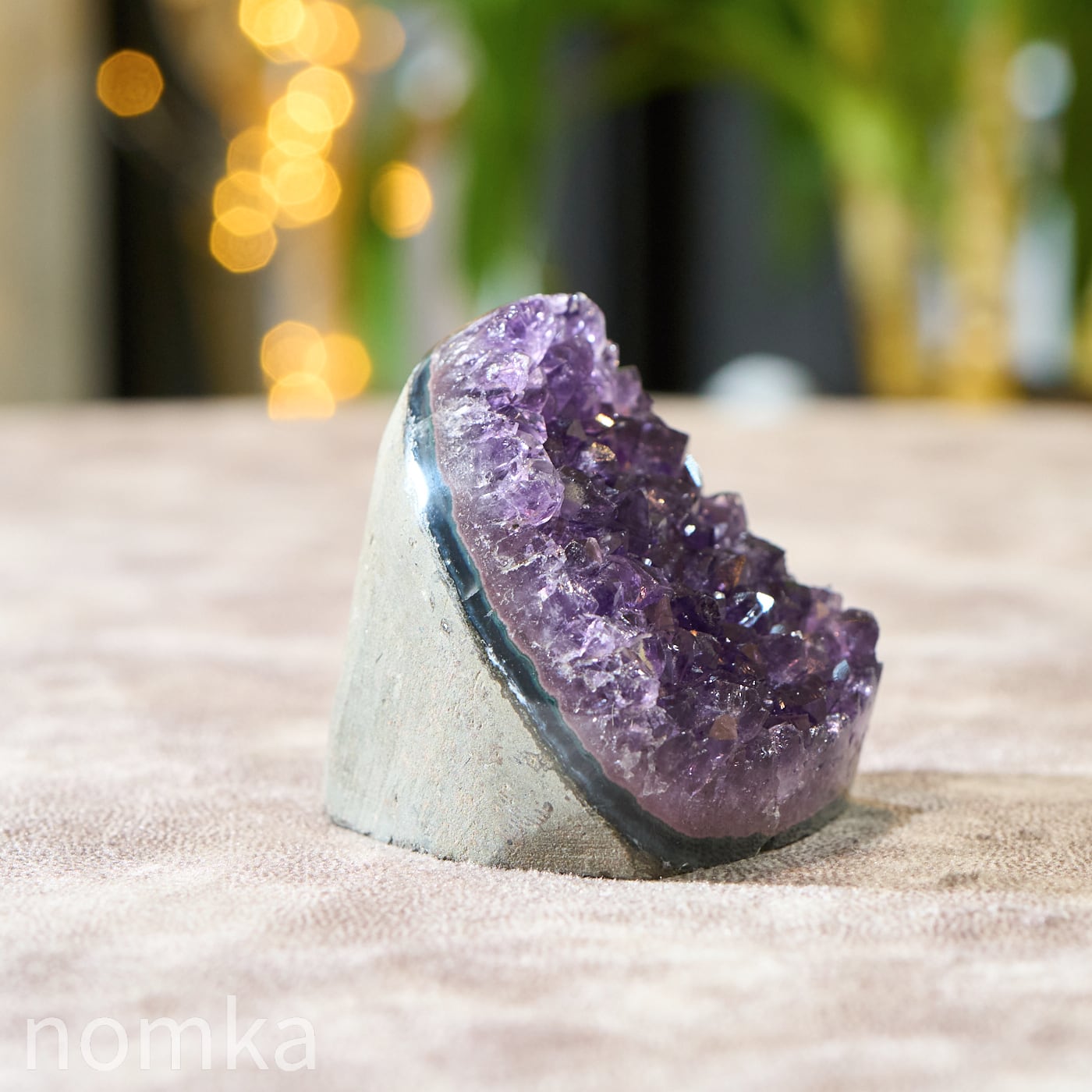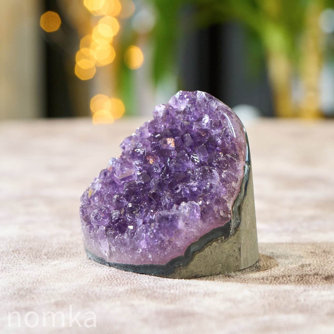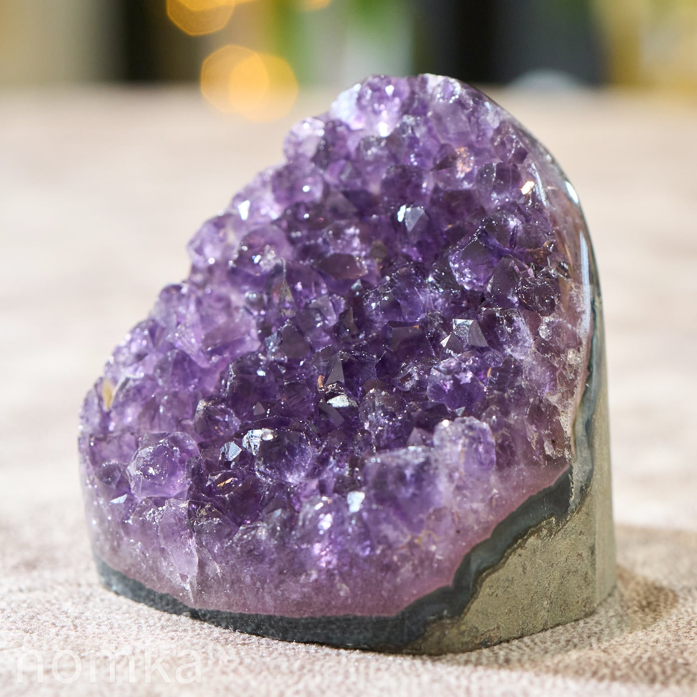 アメジストドームのように、母岩をカットして結晶面を際立たせたものは、大地の創造力と人の手による仕上げが融合した、まさに「紫の芸術品」。母岩のマットな質感と、結晶の煌めきのコントラストを、ぜひ様々な角度からお楽しみください。
