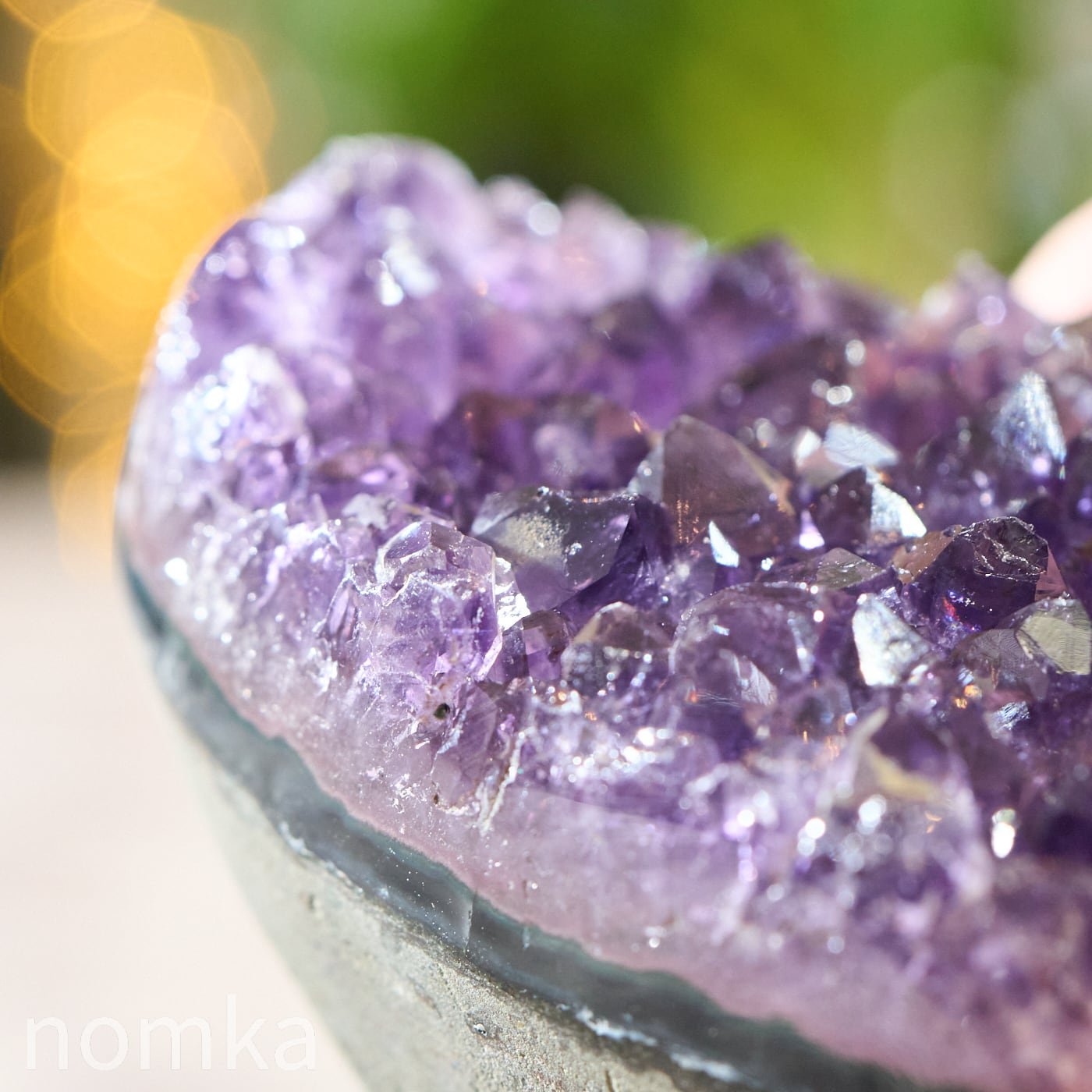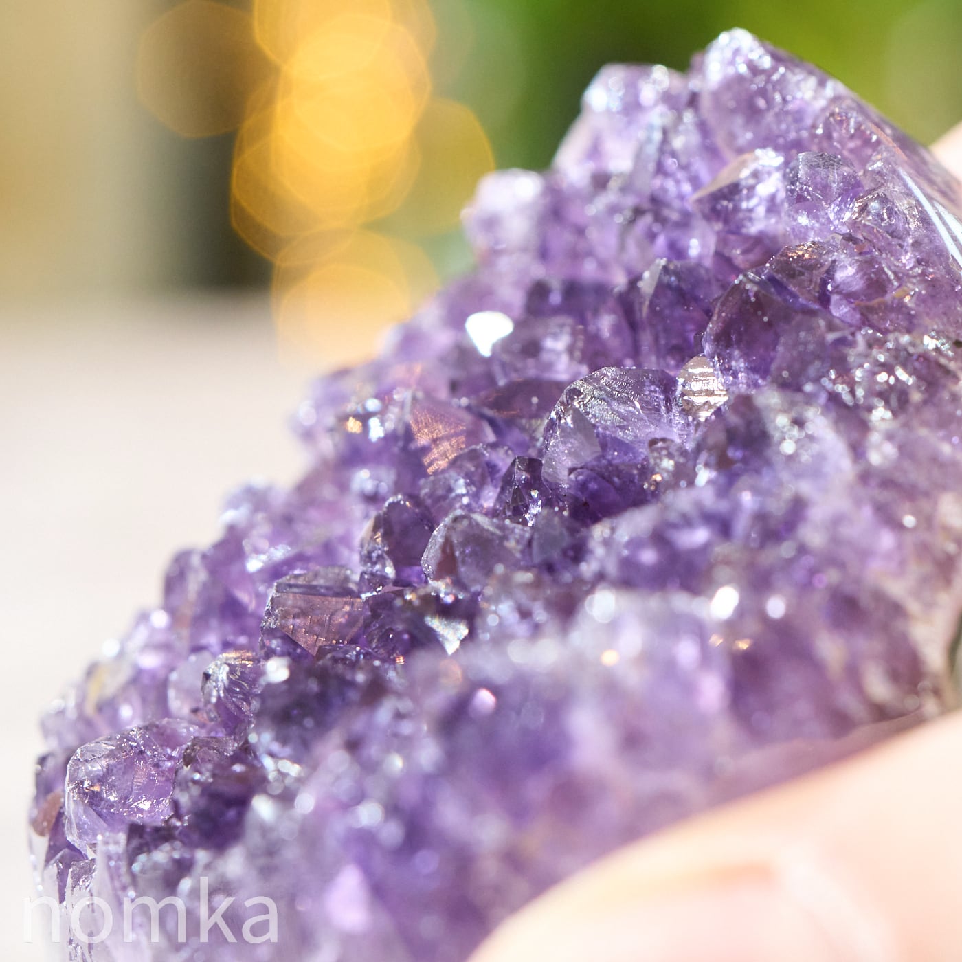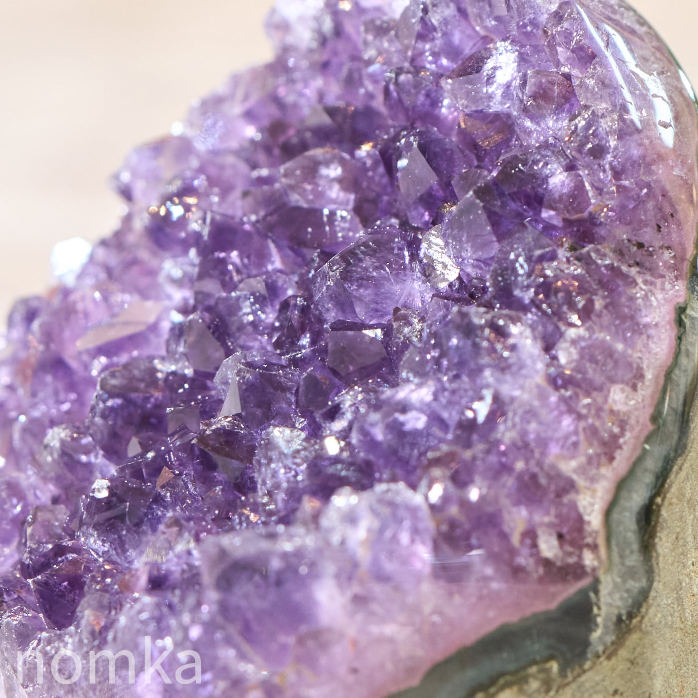 アメジストドームのように、母岩をカットして結晶面を際立たせたものは、大地の創造力と人の手による仕上げが融合した、まさに「紫の芸術品」。母岩のマットな質感と、結晶の煌めきのコントラストを、ぜひ様々な角度からお楽しみください。