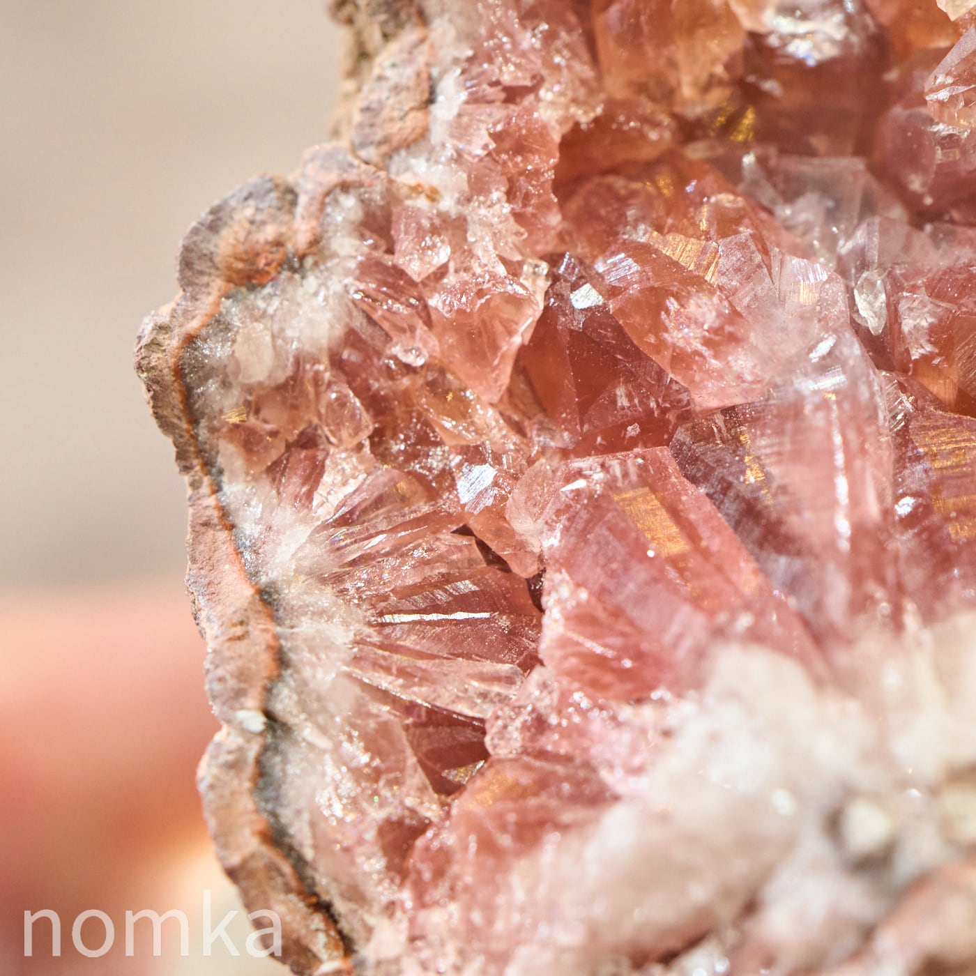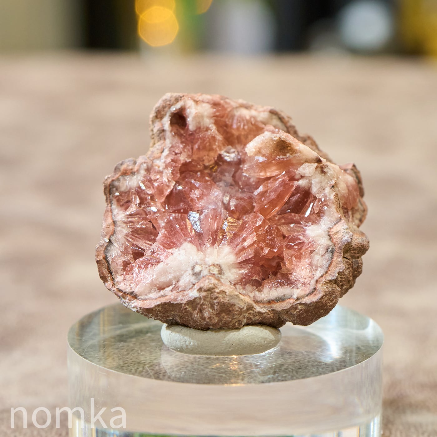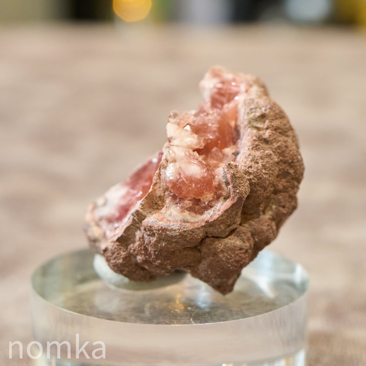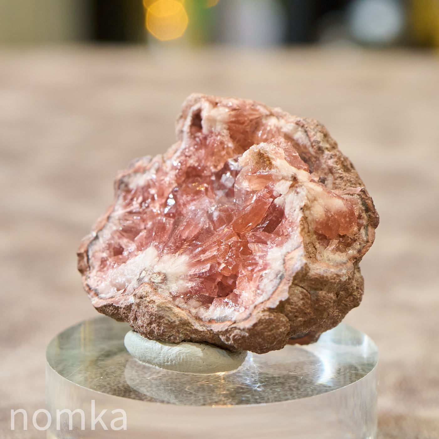淡いピーチピンクの中に時折混ざる、少し濃いめの色合いや母岩の質感が、より一層結晶の輝きを引き立てています。