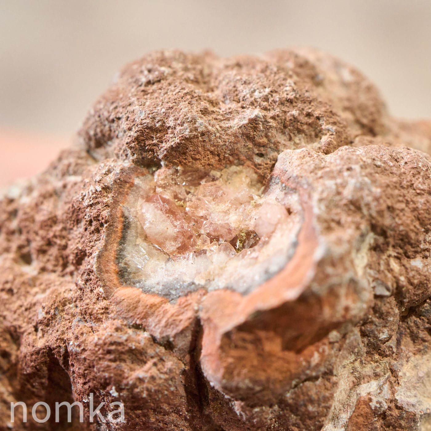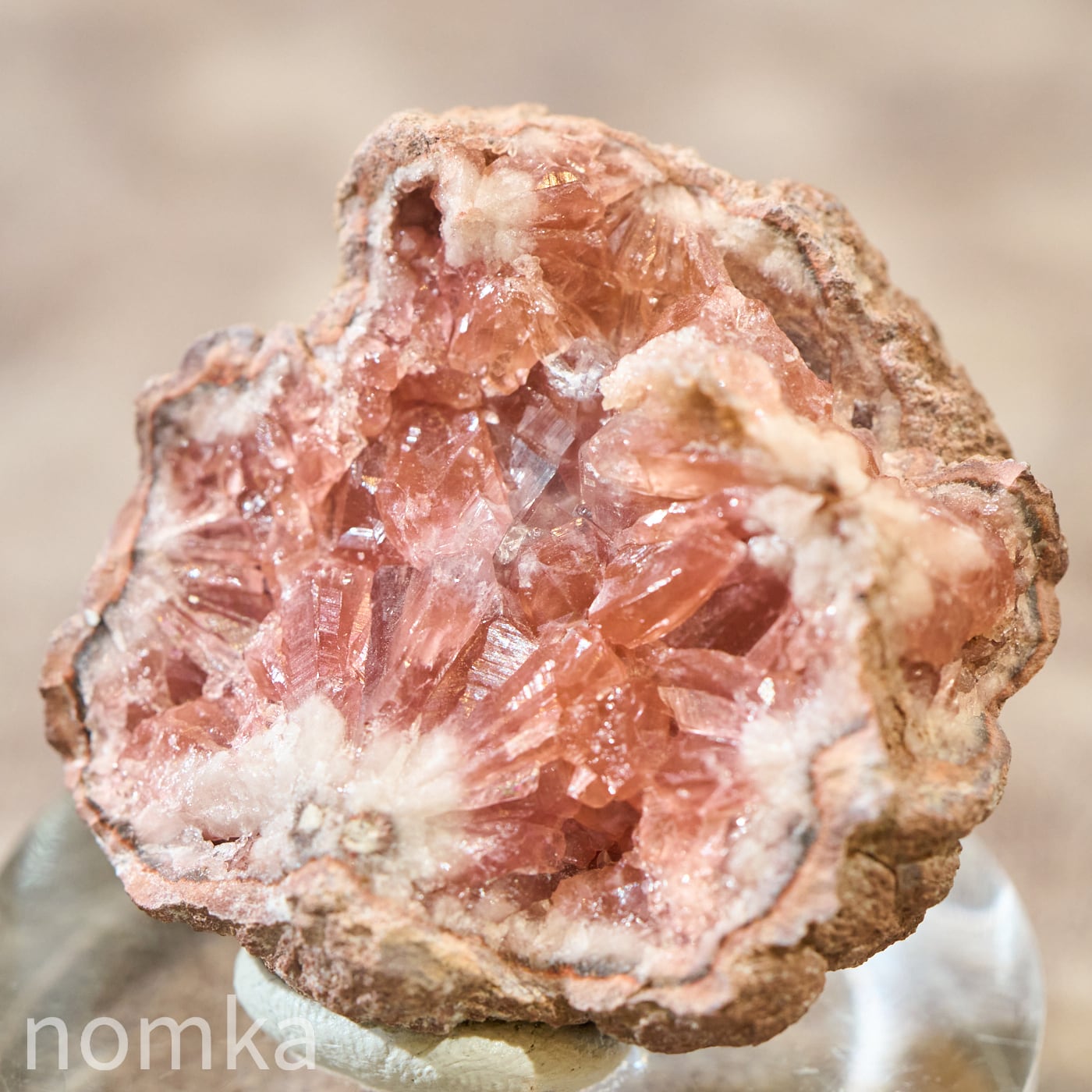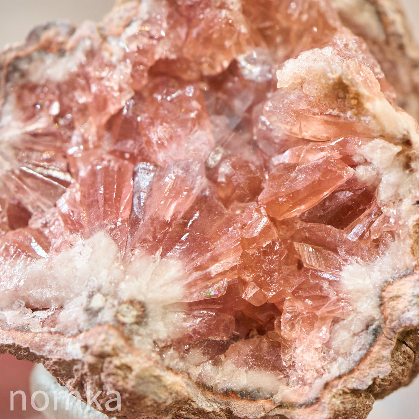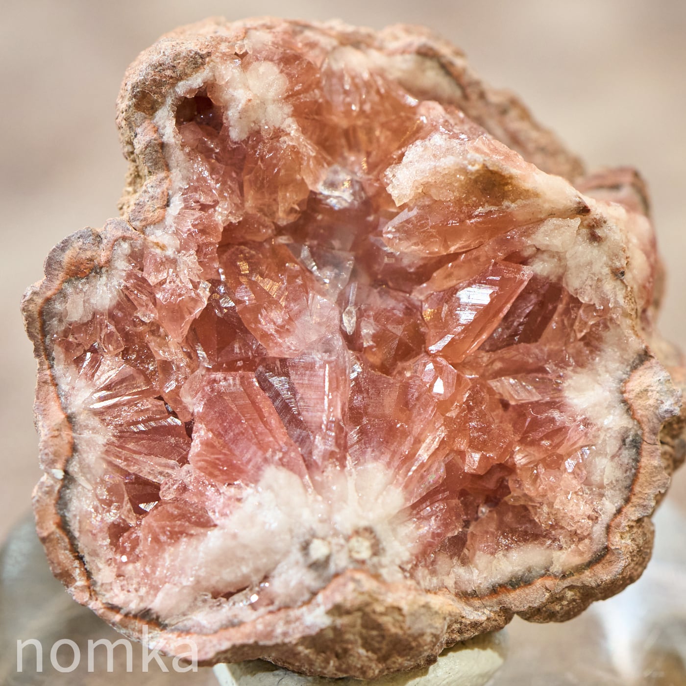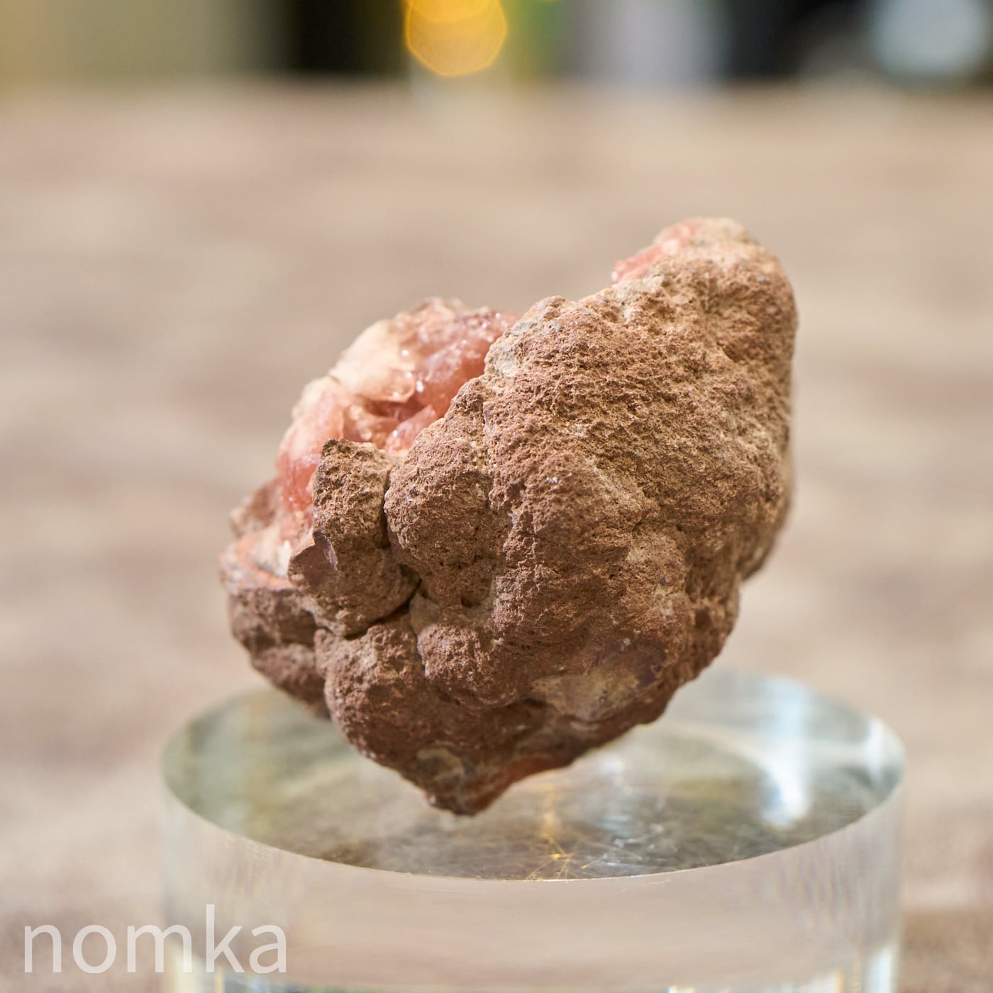 淡いピーチピンクの中に時折混ざる、少し濃いめの色合いや母岩の質感が、より一層結晶の輝きを引き立てています。