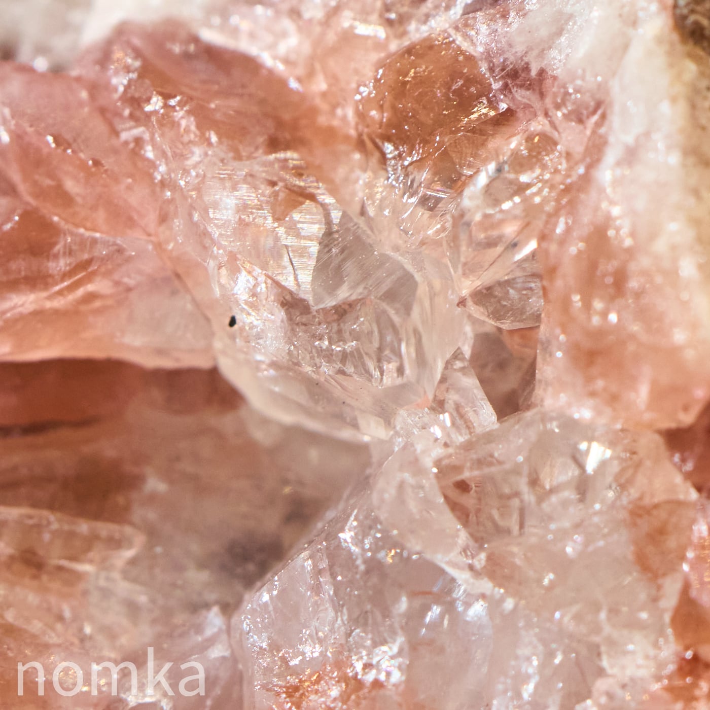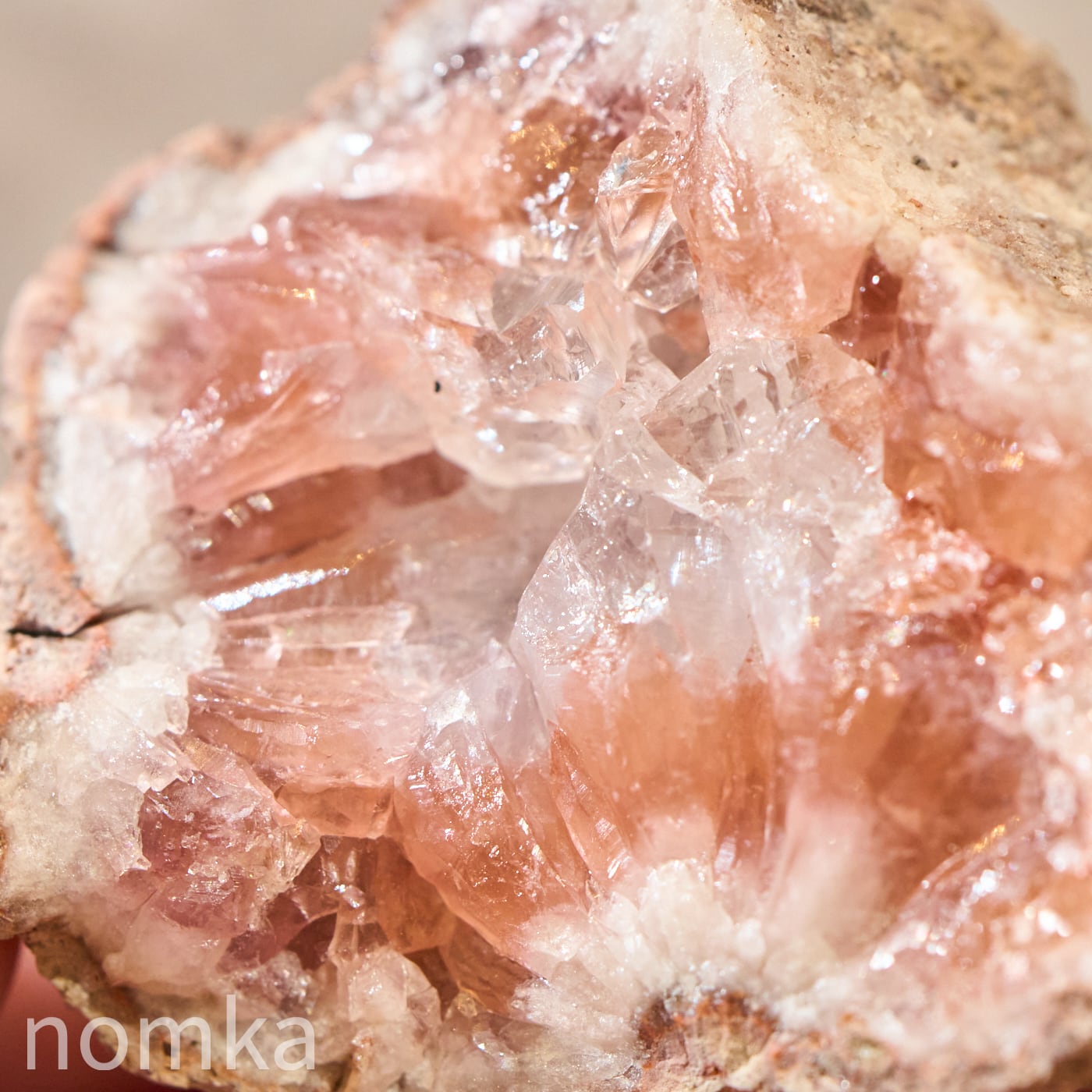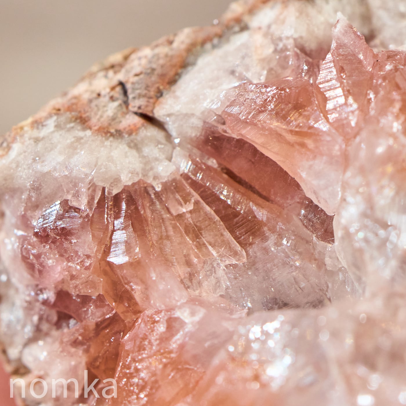 まるで淡いサクラ色のアメジストが、その中心にある純粋な水晶を大切に守り、包み込んでいるかのよう。光を当てると、ピンクの優しい輝きの中から、水晶の透明な光がパッと解き放たれ、そのコントラストの美しさに心奪われます。