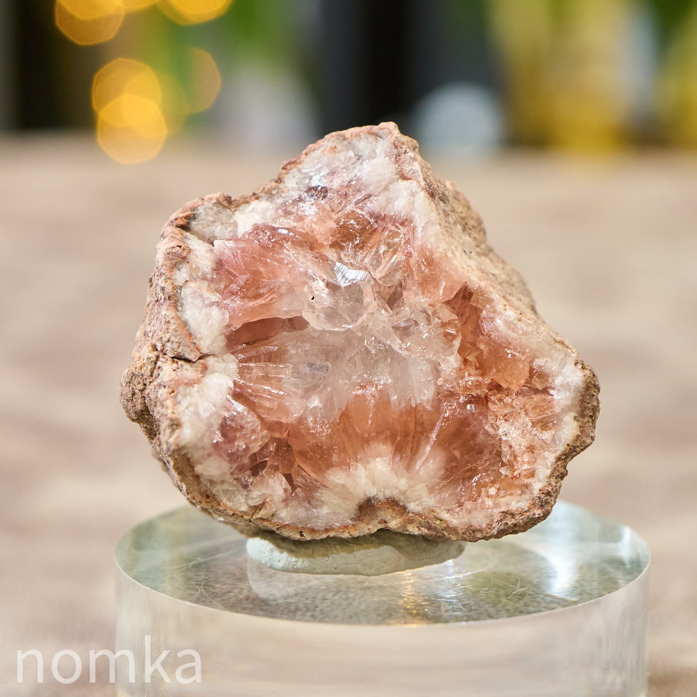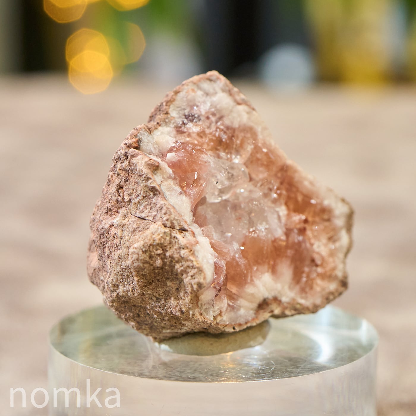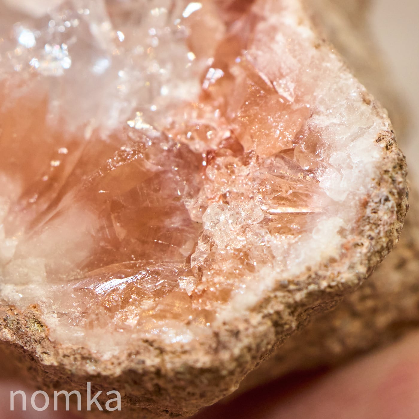 まるで淡いサクラ色のアメジストが、その中心にある純粋な水晶を大切に守り、包み込んでいるかのよう。光を当てると、ピンクの優しい輝きの中から、水晶の透明な光がパッと解き放たれ、そのコントラストの美しさに心奪われます。