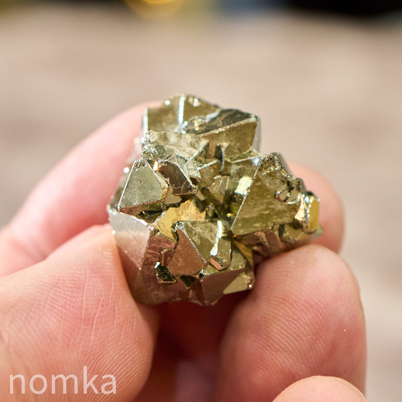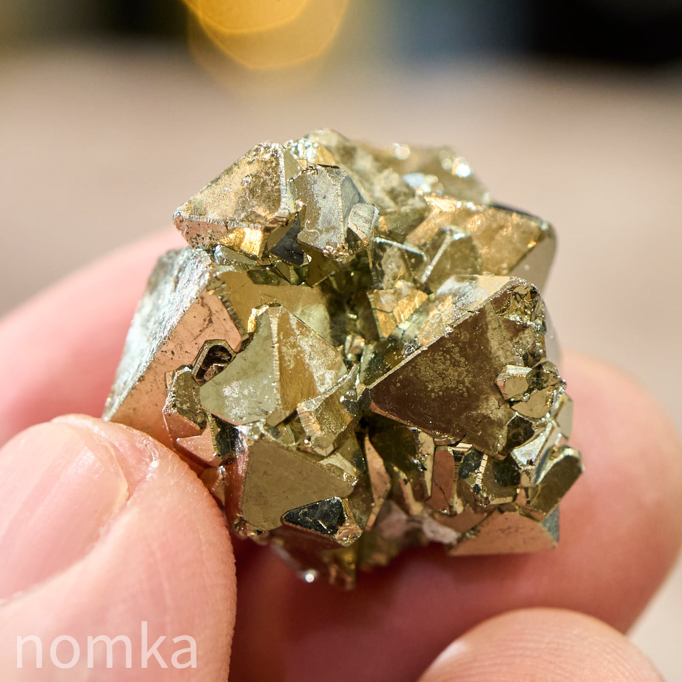 八面体の結晶がギュッと凝縮して重なり合い、まるで黄金の果実のような、あるいは「おむすび」のような、どこかほっとする愛嬌のある形をしています。