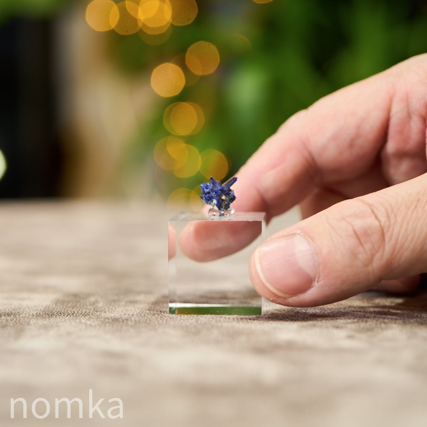 約1cm四方の小さな世界に、アズライト本来の力強い発色と、繊細な結晶のきらめきがぎゅっと凝縮されています。光をあてると、深い紺色の隙間から鮮烈なブルーがキラリと輝き、この石が持つ神秘的なエネルギーを静かに主張します。
