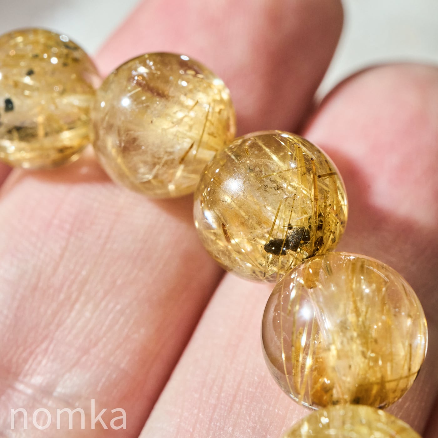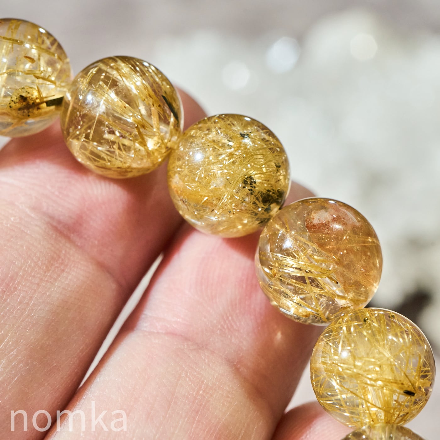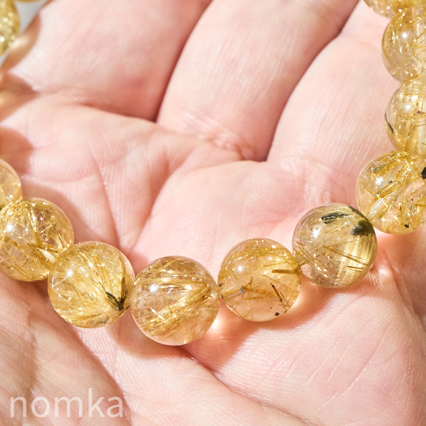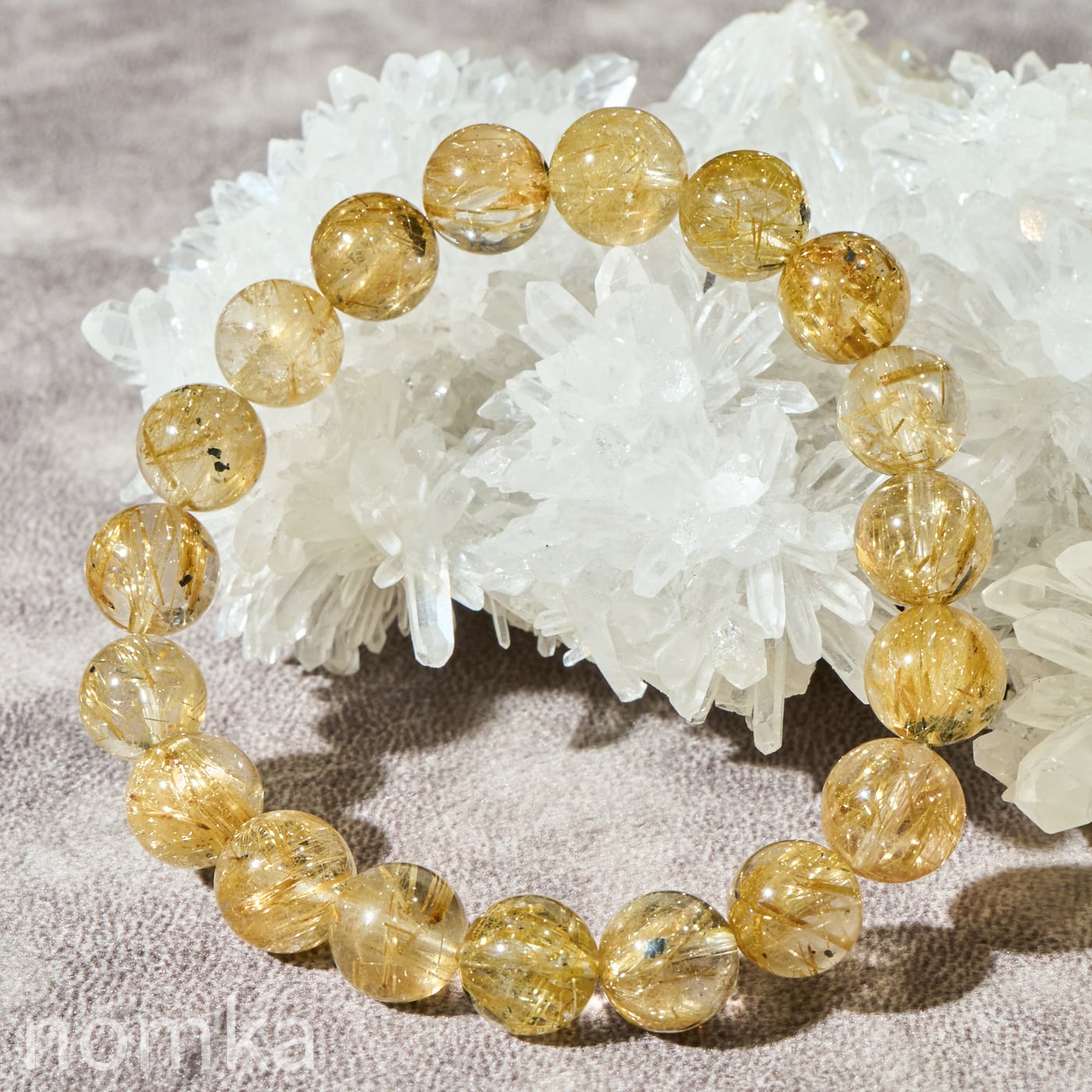 高い透明度を誇る水晶の中に、鮮やかなシャンパンゴールドからゴールドの輝きを放つルチル(金紅石)が密に内包された、ブラジル産の高品質ブレスレットです。