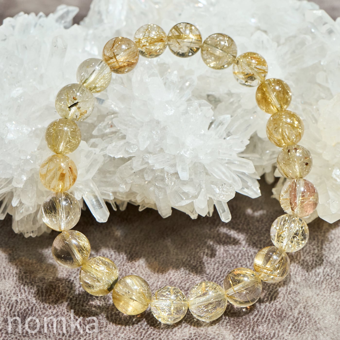 一粒一粒に個性があり、ヘマタイトの黒とルチルの金が織りなす景色は、天然石ならではの「一点物」の喜びを教えてくれます。