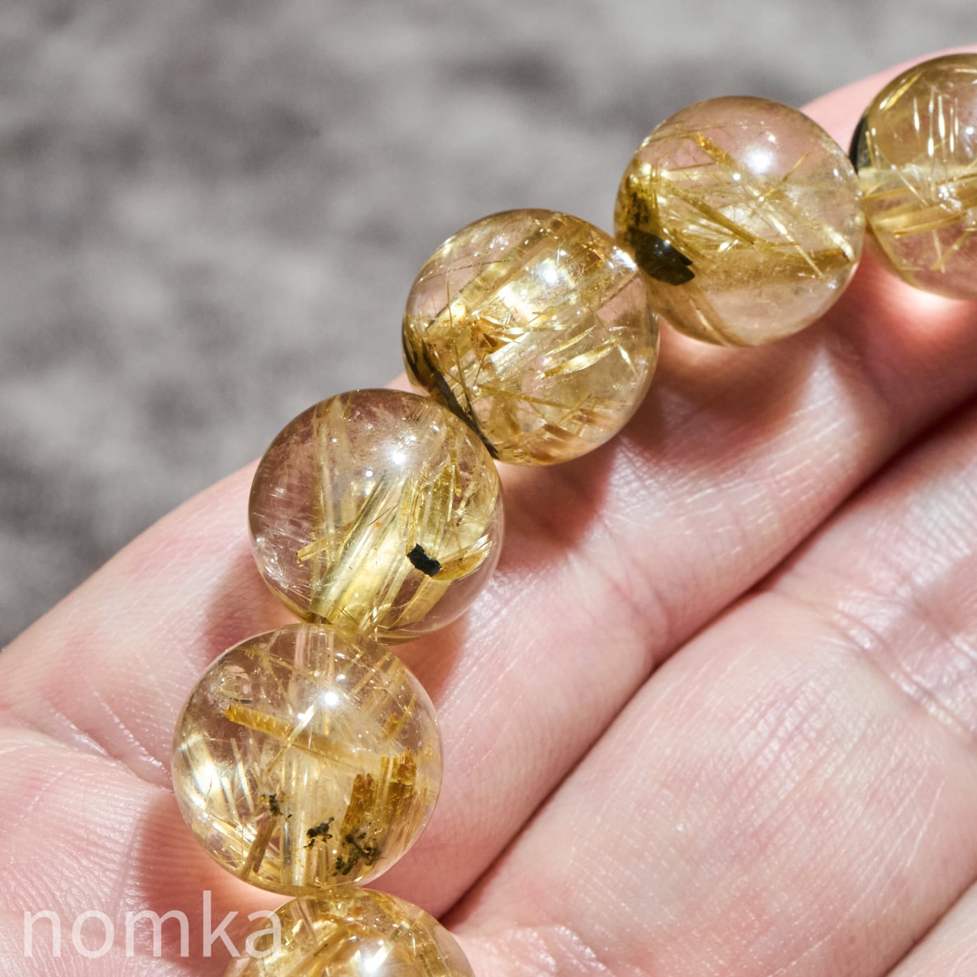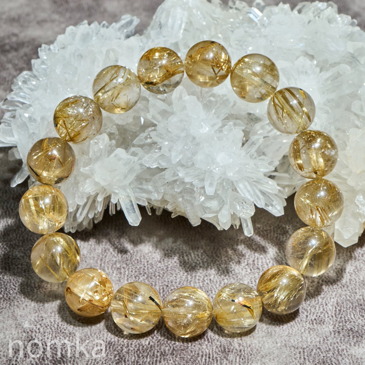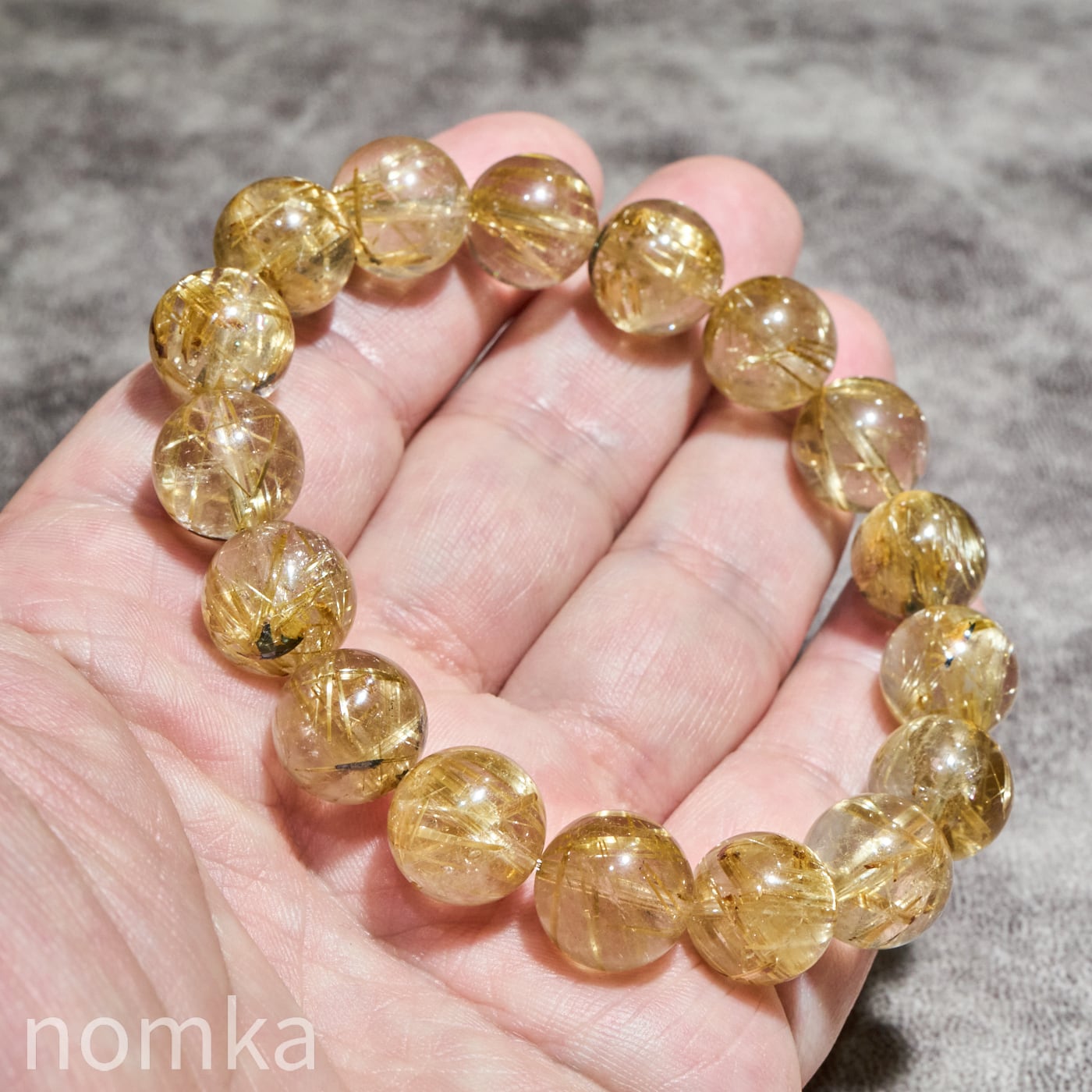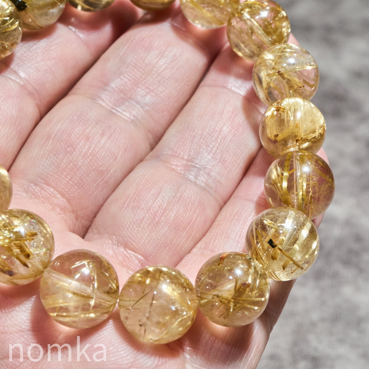 12mmを超える大玉において、これほどの透明度と針の太さを両立させるのは至難の業です。小さな珠では表現しきれない、ルチルの「成長の軌跡」が手に取るように分かるのは大玉だけの特権です。