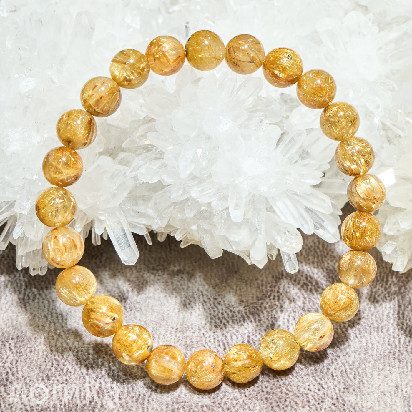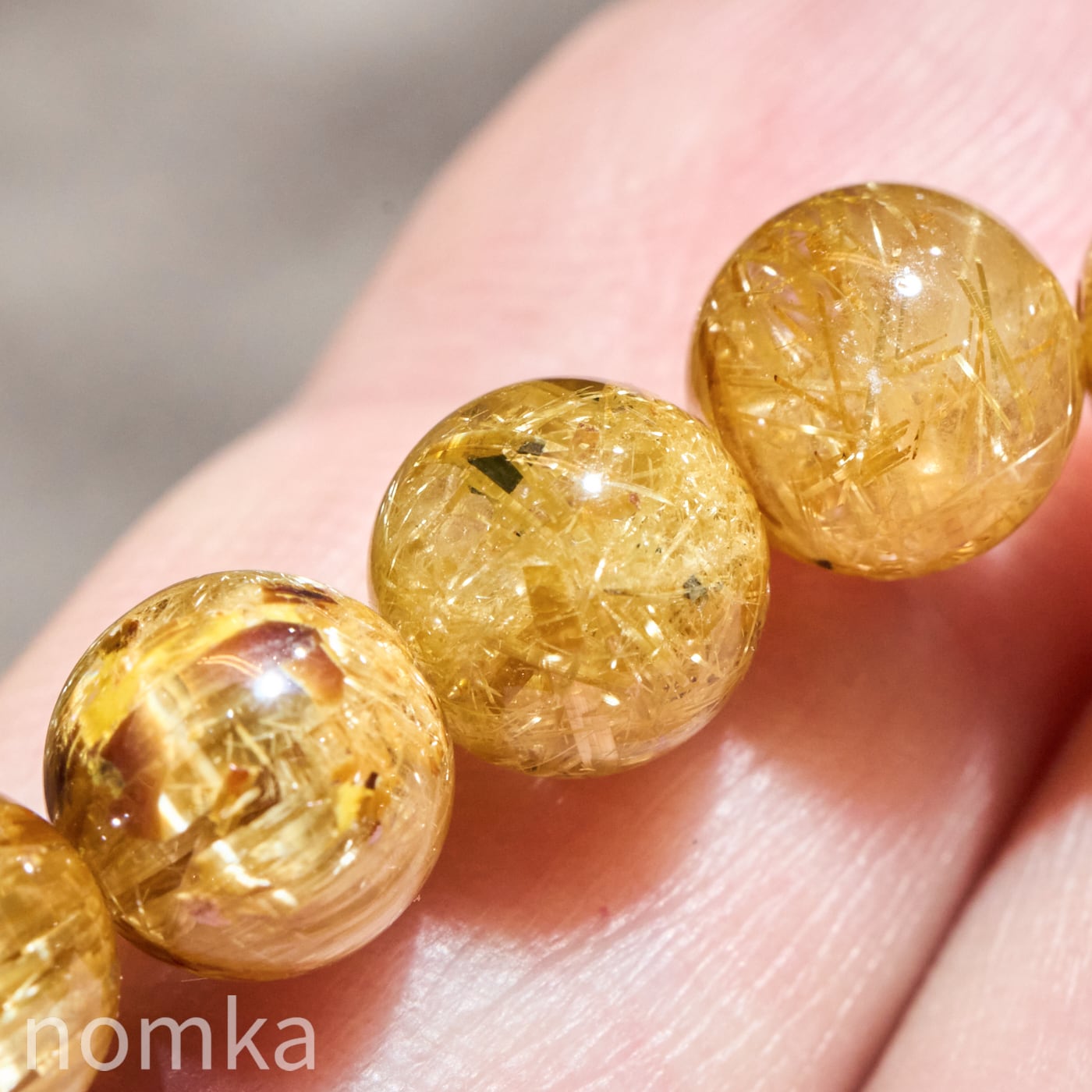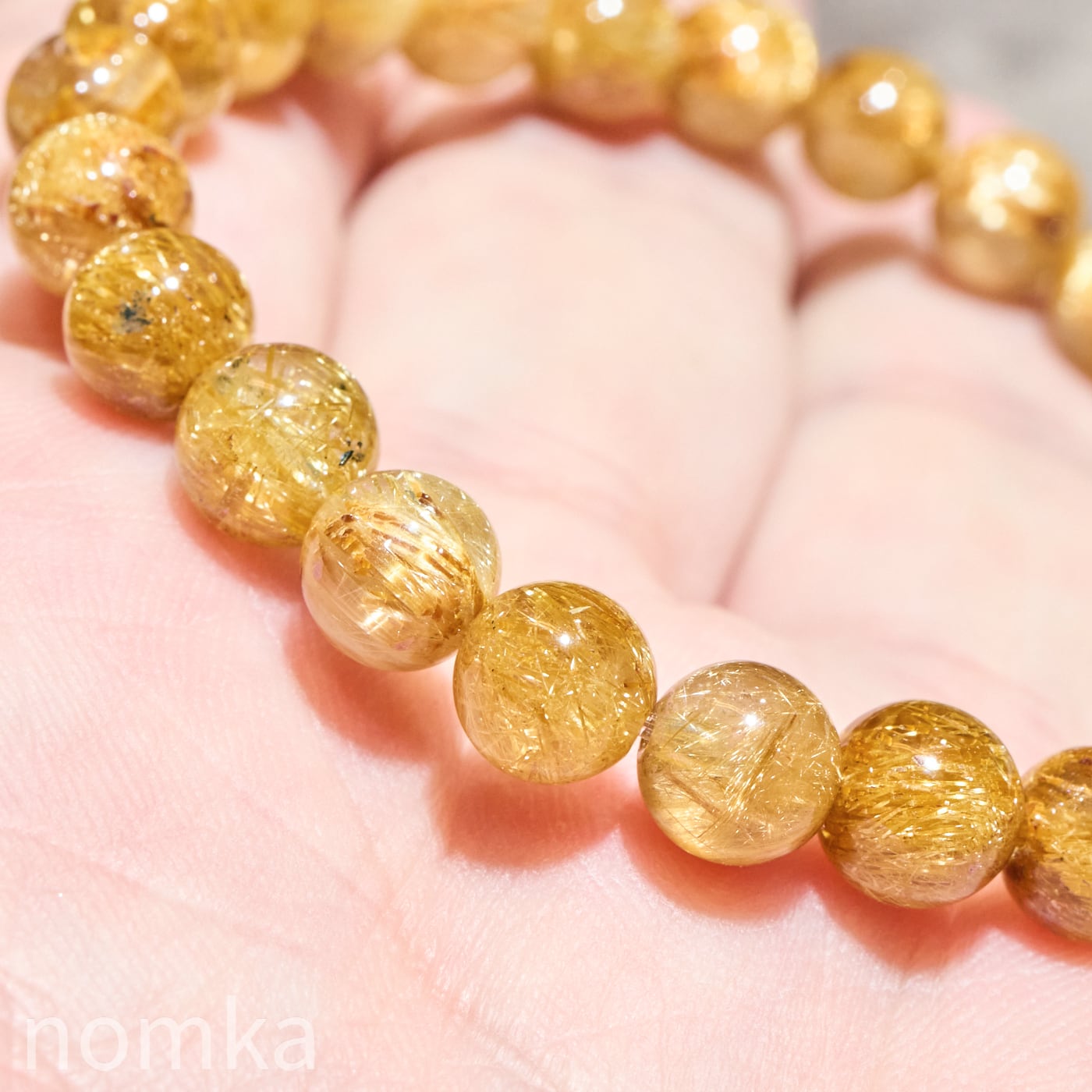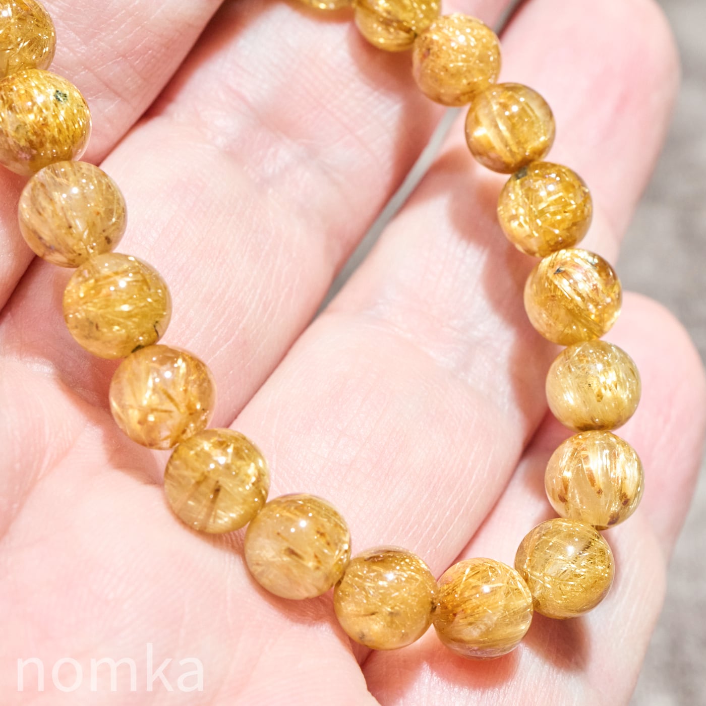 本品は7mmという扱いやすいサイズでありながら、どの角度から見ても「金色」を感じさせるほどの密度を誇ります。ただの金針水晶に留まらない、光の芸術品としてのルチルクォーツを、ぜひその腕元でお楽しみください。