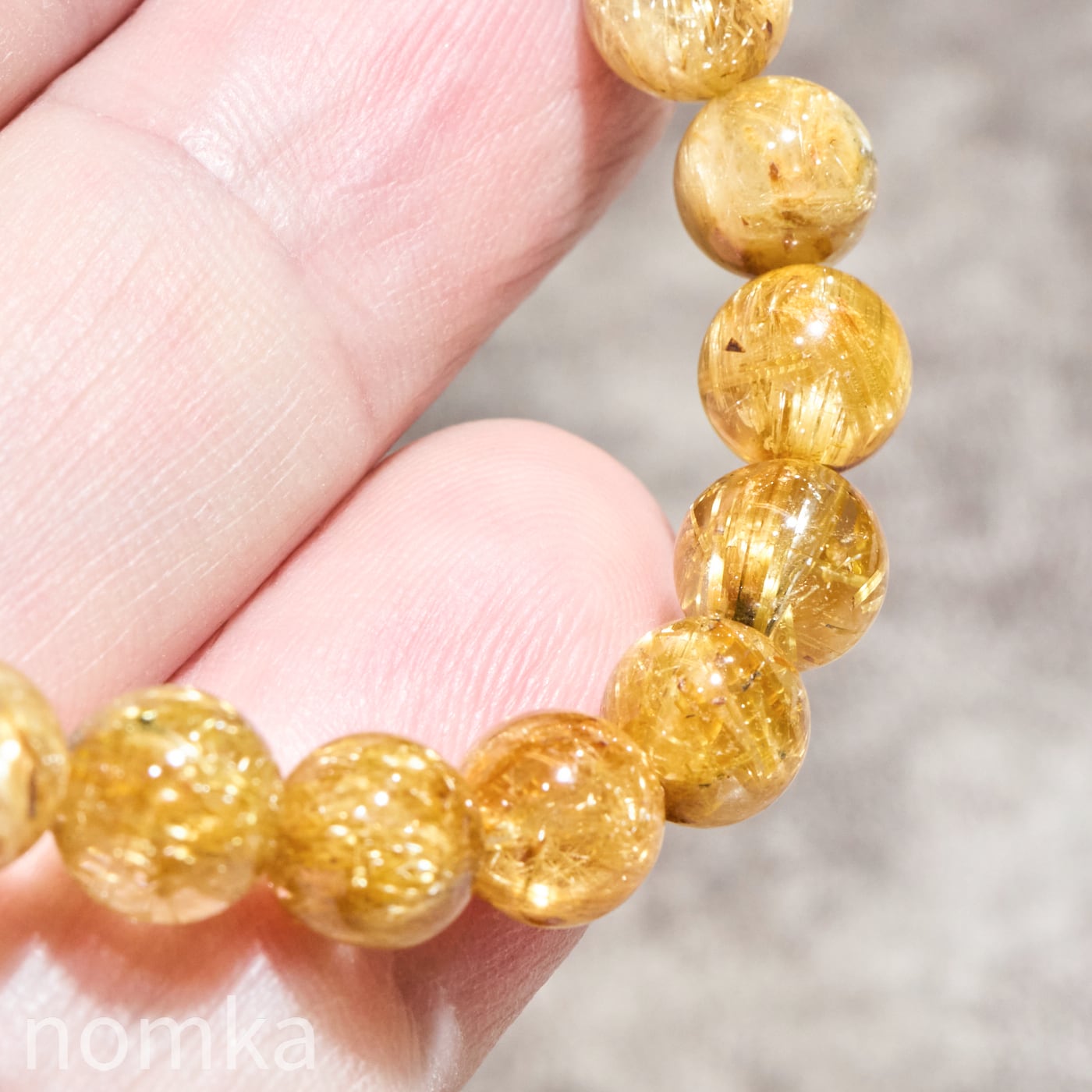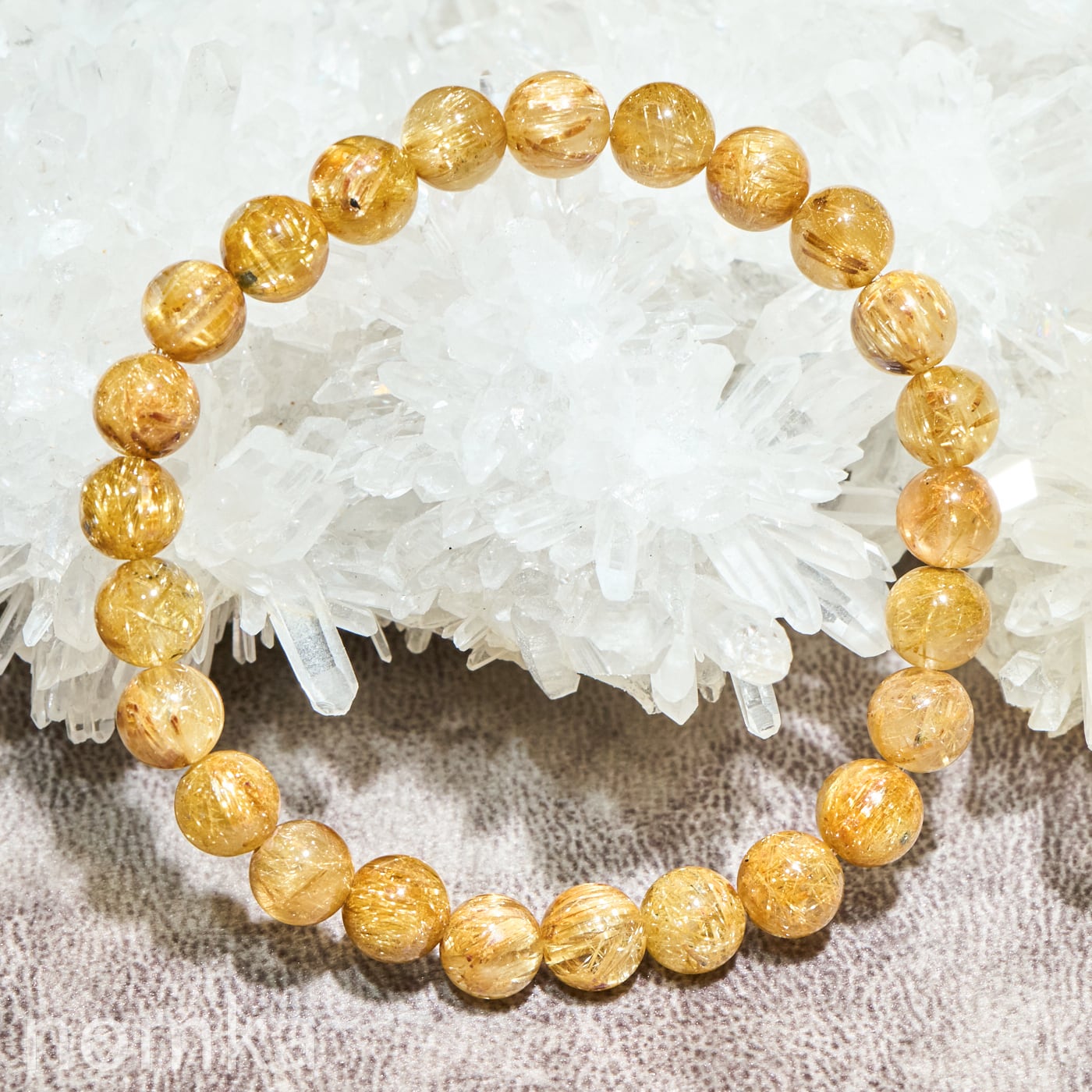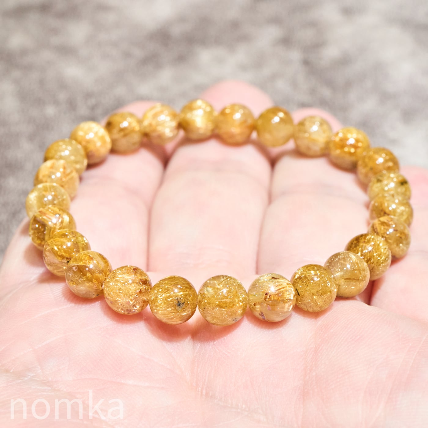 本品は7mmという扱いやすいサイズでありながら、どの角度から見ても「金色」を感じさせるほどの密度を誇ります。ただの金針水晶に留まらない、光の芸術品としてのルチルクォーツを、ぜひその腕元でお楽しみください。