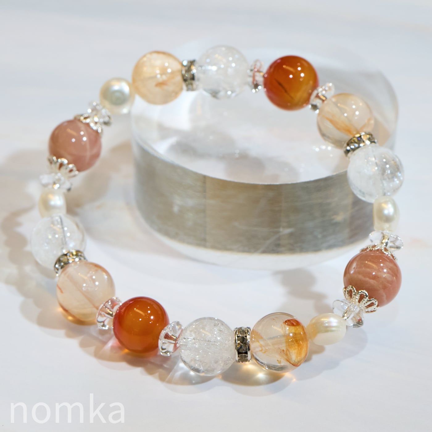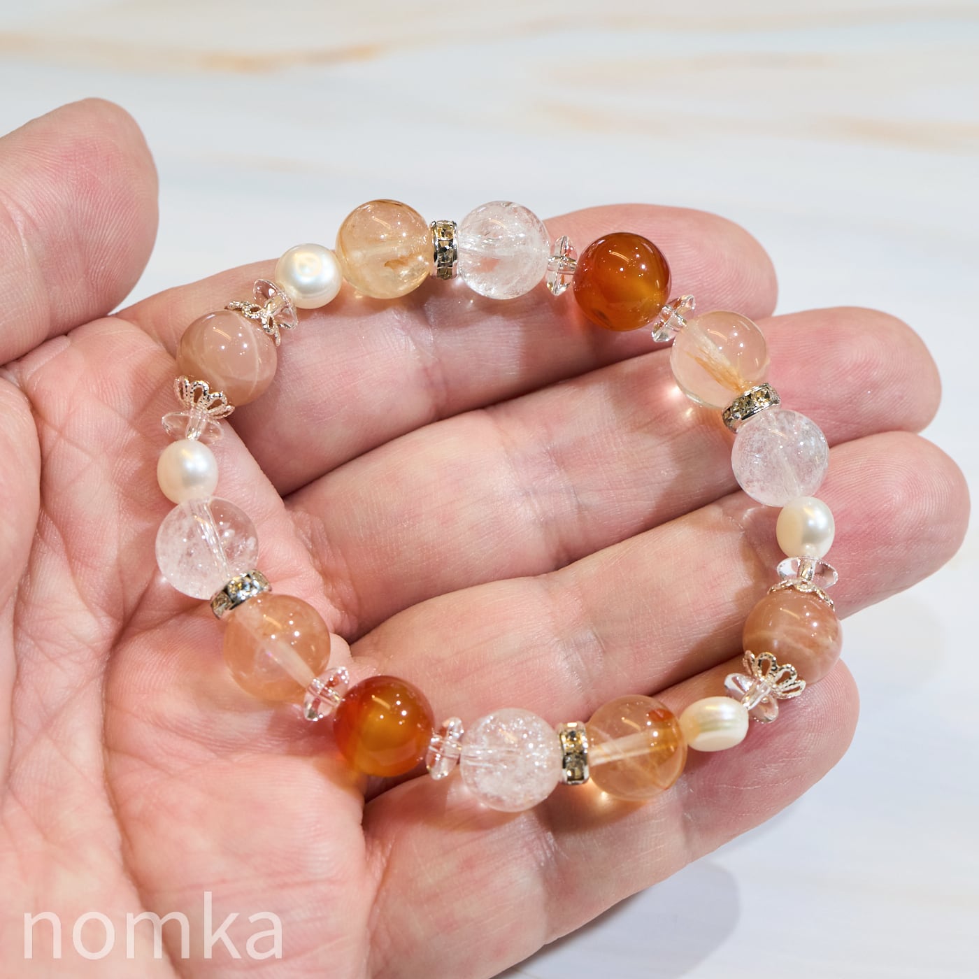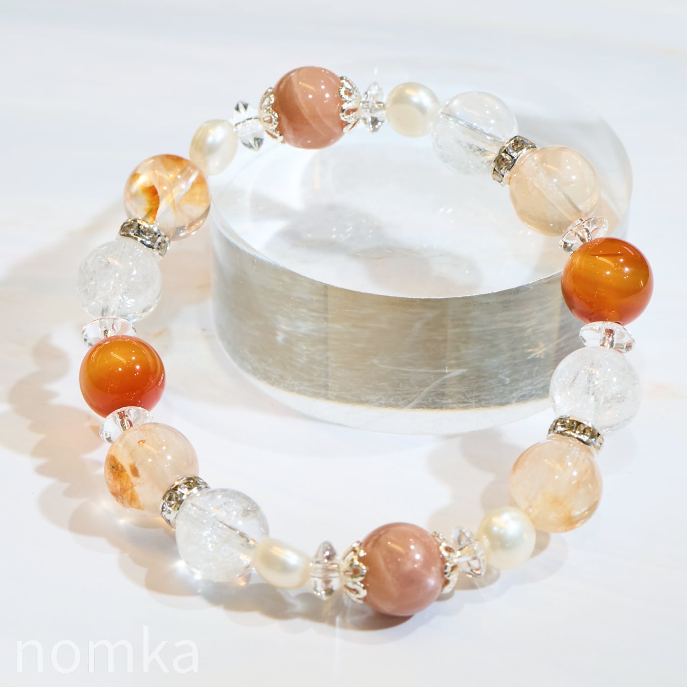 鮮やかなカーネリアンに、柔らかな光を宿すオレンジムーンストーン、そして力強いエネルギーを感じさせるライモナイトインクォーツを贅沢に組み合わせました。