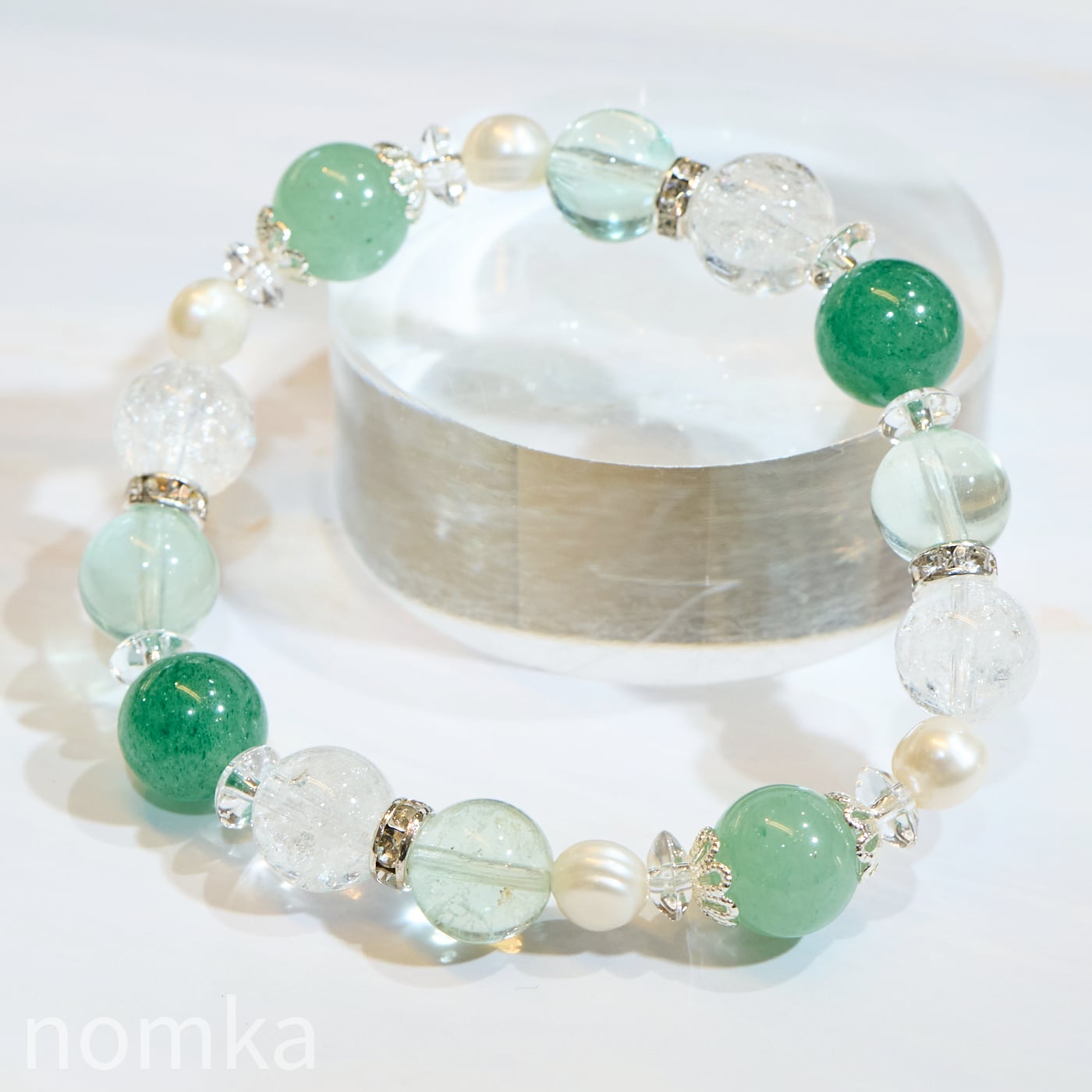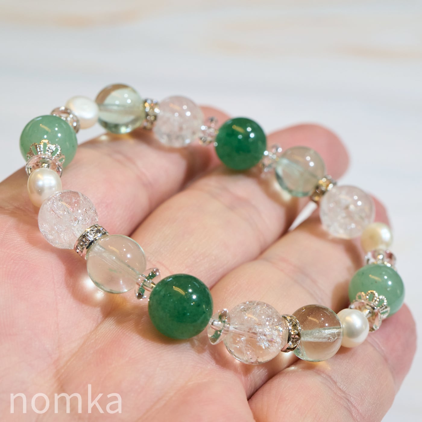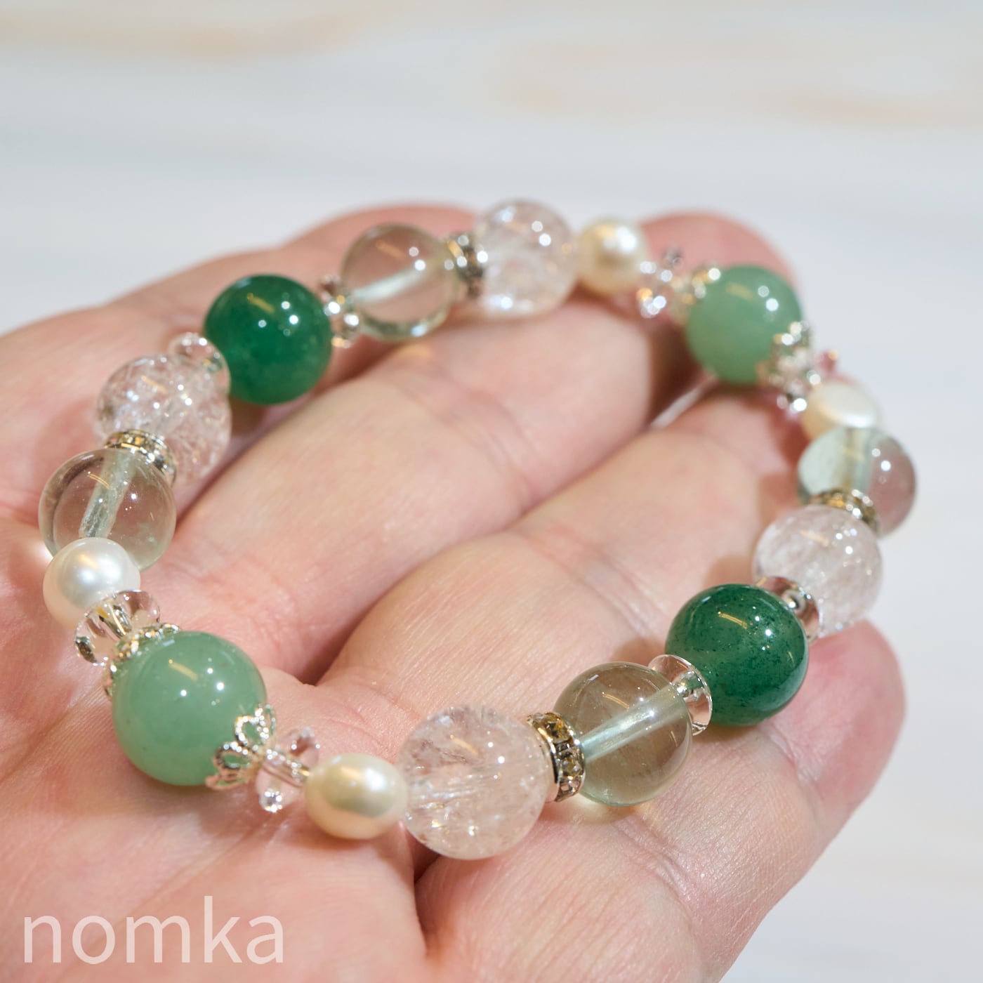 落ち着いたグリーングラデーションの中に、パールの艶やかさがアクセントとなり、カジュアルからフォーマルまで幅広く手元を彩ります。