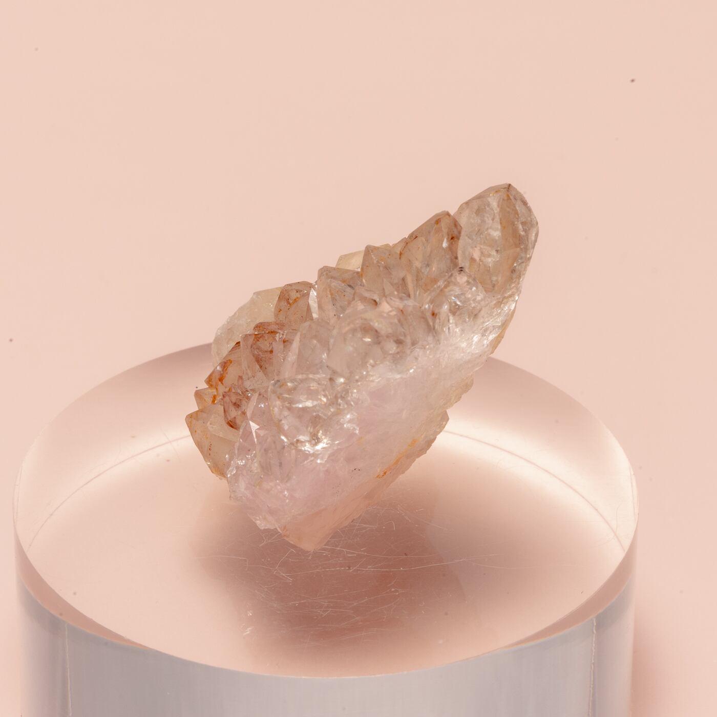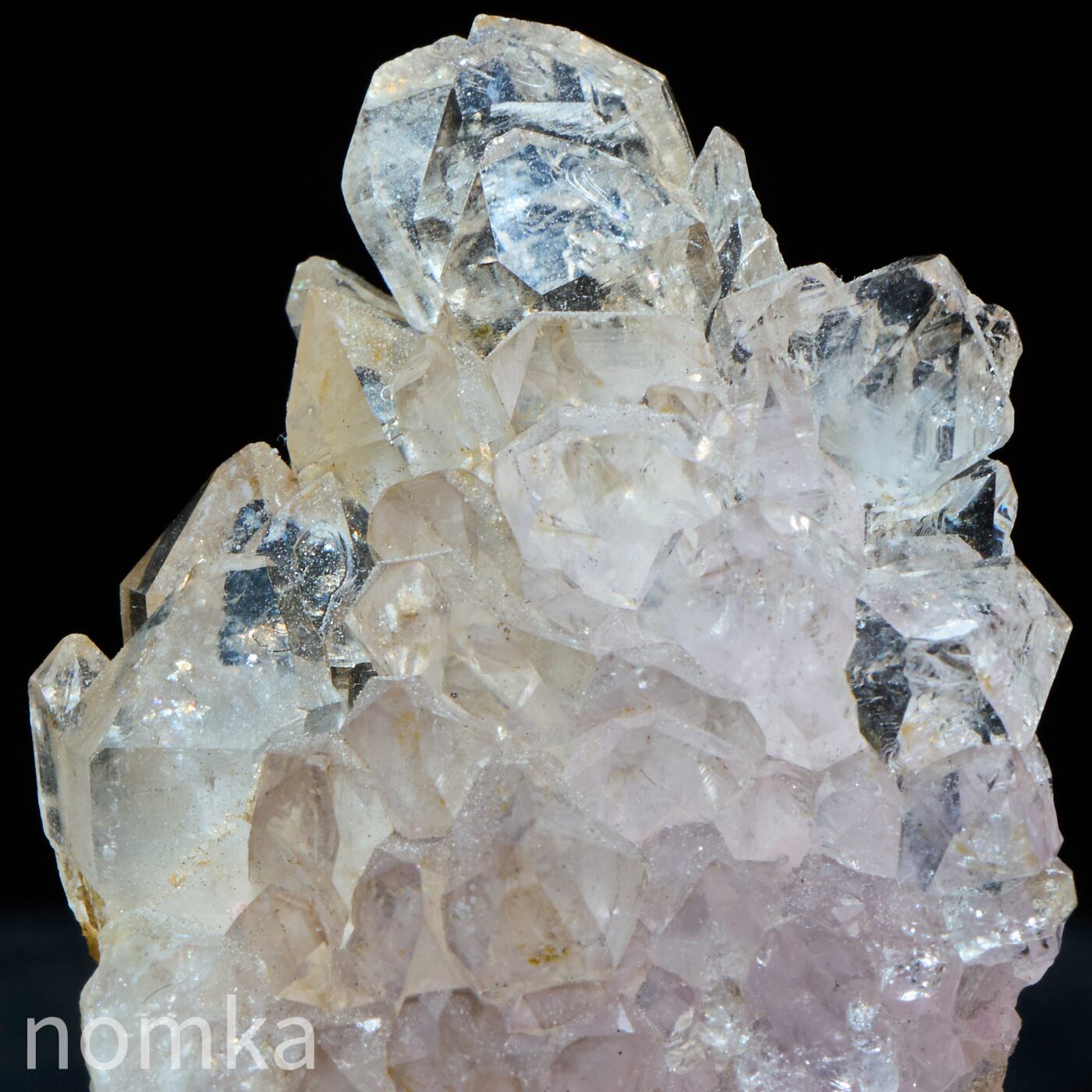 こちらのクラスターは根元の部分が淡いピンクで先端は透明で拡大してみると先端はシトリンの様な色をしているところもあります。