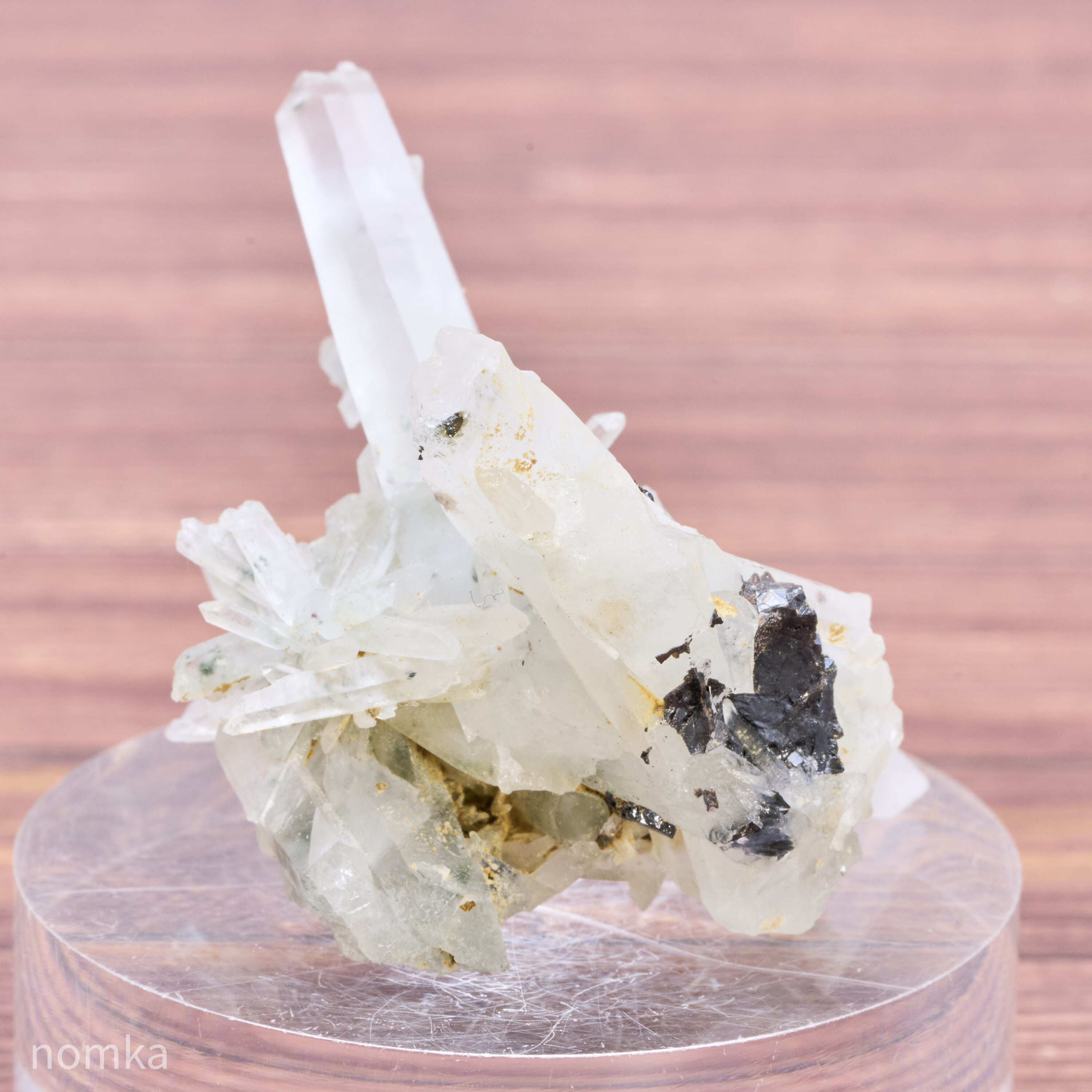 曇りガラスのように美しく剣が細長い水晶に、ガレナ(方鉛鉱)が共生した独特のスタイルのクラスターです。