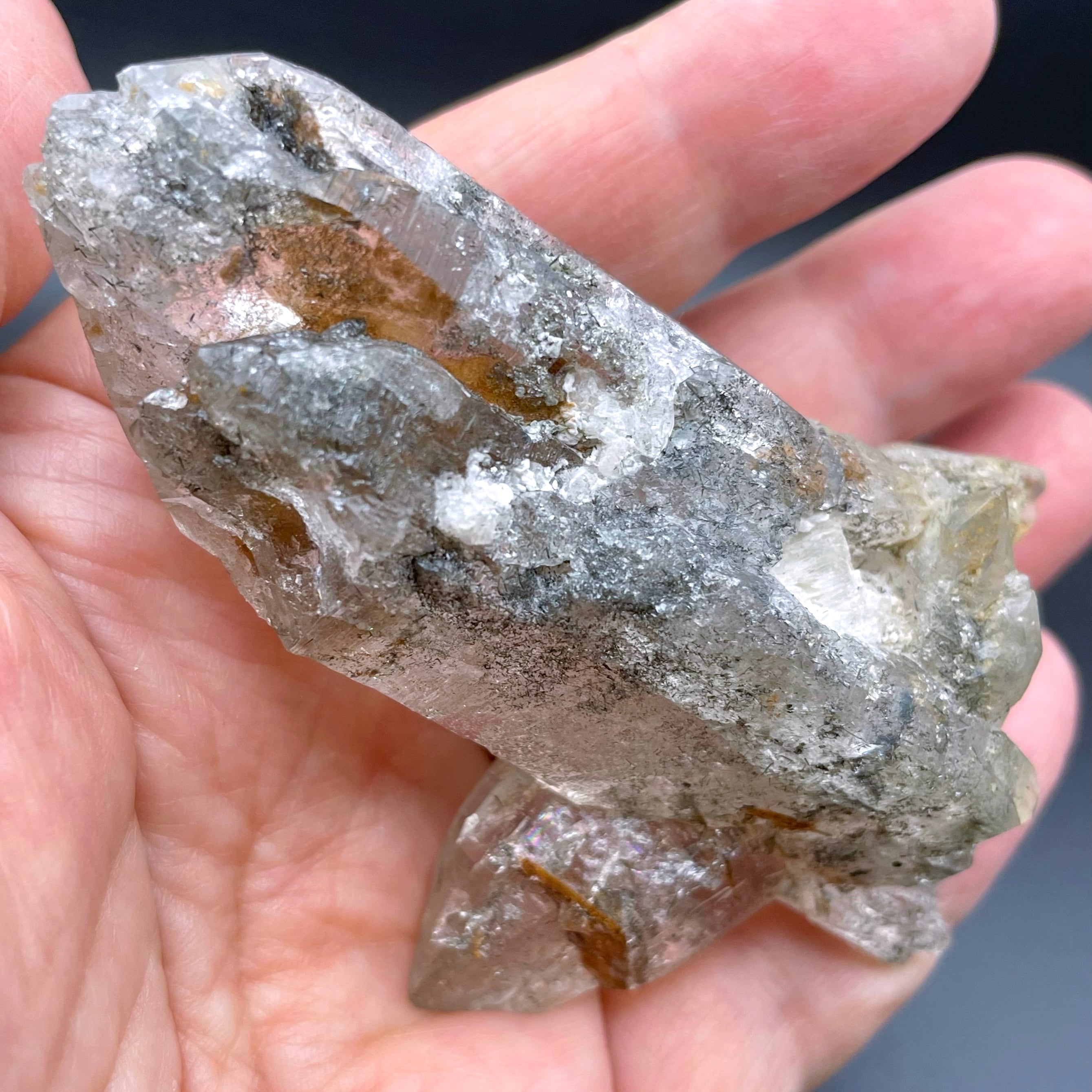 裏側の表面にはクローライトが付着しており、対して表側の表面は当面度が高いので水晶の中で素敵な世界観が広がっています。また、セルフフィールドや貫入部分が見られ、また貫入したポイントにアイリスも見ることができる、多方面で見応えがあるクラスターです。